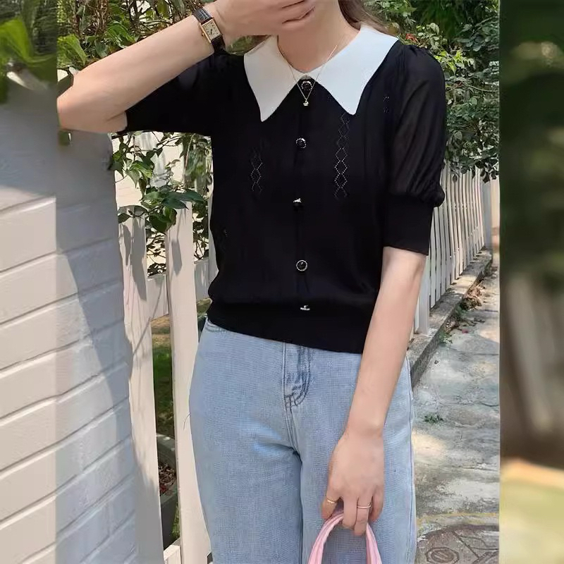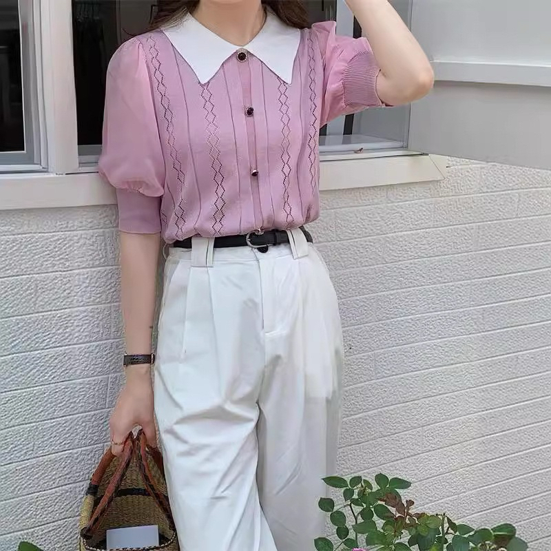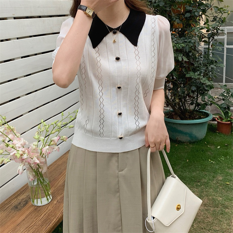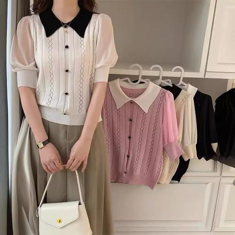 Atasan Knit Lengan Pendek (A335)- Atasan Wanita Rajut + Lengan Sifon