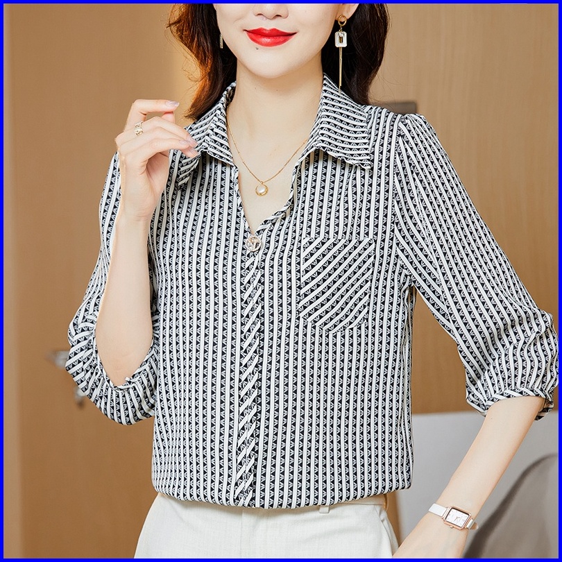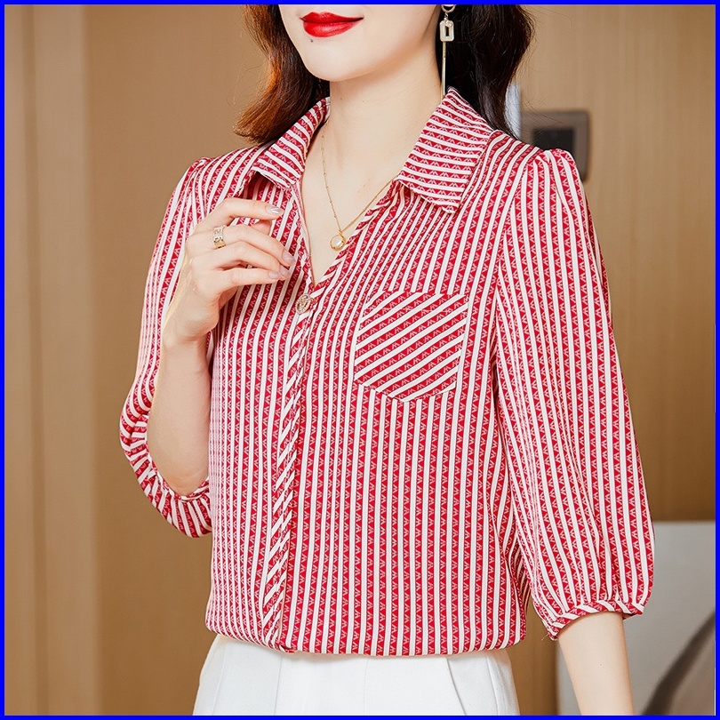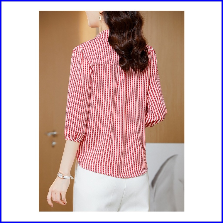 New Fashion Korean Style Red Black Stripes Women Blouse Summer 3 4 Sleeve Length Shirts Tops
