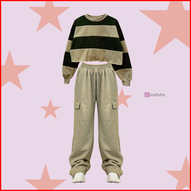One Set Stripe Croope Sweater Jooy Cargo Sweetpants Wanita