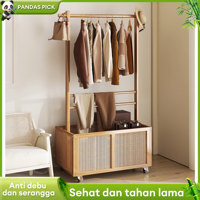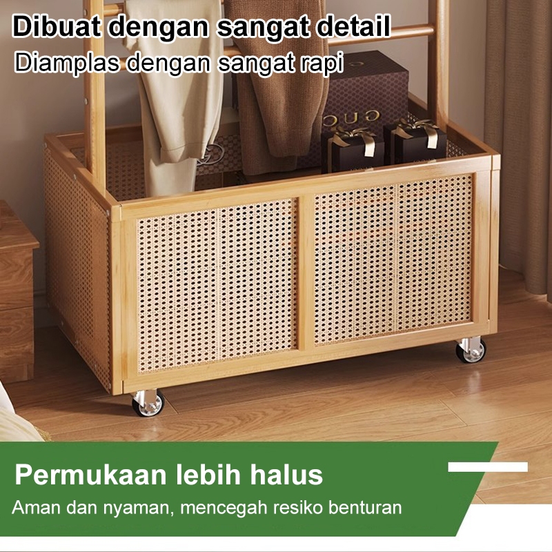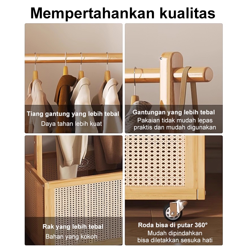 [Star]Gantungan Baju Berdiri Stand Hanger Baju Rak Gantungan Kayu Jemuran Pakaian Roda Keranjang