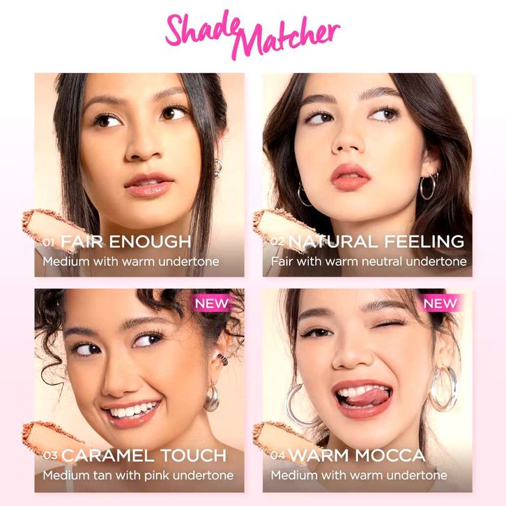 01 fair enough, 02 natural feeling, 03 caramel touch, 04 warm mocca
