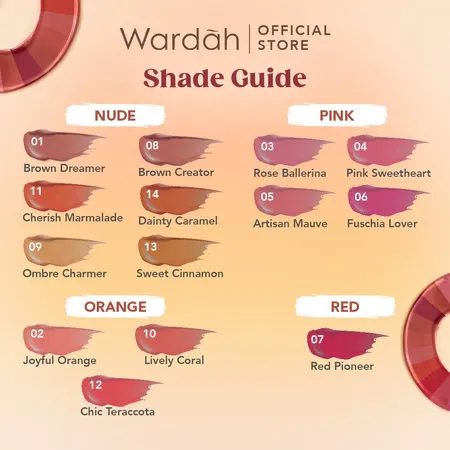 01 BROWN DREAMER, 02 JOYFUL ORANGE, 03 ROSE BALLERINA, 04 PINK SWEETHEART, 05 ARTISAN MAUVE, 06 FUCHSIA LOVER, 07 RED PIONNER, 08 BROWN CREATOR, 09 OMBRE CHARMER, 10 LIVELY CORAL, 11 CHERIS MARMALADE, 12 CHIC TERRACOTTA, 13 SWEET CINNAMON, 14 DAINTY CARAMEL, 15. TRANQUIL HAZEL, 17. BEYOND SUNSET, 21. MAGNETIC RED, 22. POISE PLUM
