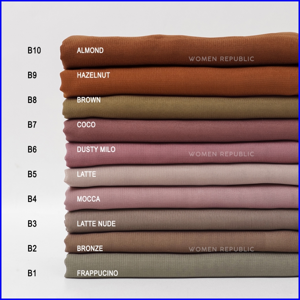 A1 CREAM, A2 COKSU, A3 LIGHT BROWN, A4 BEIGE, A5 DARK BROWN, A6 CINNAMON, A7 MILO, A8 PEANUT, A9 KHAKI, A10 COKLAT PRAMUKA, CLASSIC HABIS, NEW OYSTER, NEW (HIGH) PUDDING, B1 FRAPPUCINO, B2 BRONZE, B3 LATTE NUDE, B4 MOCCA, B5 LATTE, B6 DUSTY MILO, B7 COCO HABIS, B8 BROWN, B9 HAZELNUT, B10 ALMOND, C1 PUTIH, C2 BROKEN WHITE, C3 AQUA MARINE, C4 LIGHT GREY, C5 DARK GREY, C6 MISTY GREY HABIS, C7 DENIM, NEW(HIGH) ROYAL BLUE, C8 DARK JEANS, C9 NAVY, C10 HITAM, D1 SALEM, D2 CORAL, D3 SEPHIA, D4 APRICOT, D5 PEACHY, D6 BLUSHPINK, D7 ROSE PINK, D8 DUSTY PINK, D9 TENDER PINK, D10 PEACH TUA, E2 DARK MAUVE, E3 MAUVE, E4 CHARCOAL HABIS, E5 CAPUCINO, E6 LAVENDER, E7 DUSTY PURPLE, E8 LILAC, E9 VIOLET, E10 BURGUNDY, F1 SOFT CORAL HABIS, F2 SWEET ORCHID, F3 NUDISH, F5 BISCOFF, F6 CARAMEL, F7 OATMEAL, F8 NUDE, F9 MUSTARD, F10 BATA HABIS, NEW OVALTINE, G1 LIME, G2 PEAR, G3 OLIVE, G4 DEEP OLIVE, G5 SEAWOOD, G6 ARMY, G7 HIJAU BOTOL, G8 EMERALD, G9 HIJAU TOSCA, G10 MINT, H1 TERRACOTA, H2 MAROON, H3 MERAH CABE, H4 FUSCHIA, H5 BABY PINK, H6 BIRU WARDAH, H7 BIRU TOSCA, H8 BENHUR, H9 DARK TERRACOTAHBS, I1 IVORY PINK HABIS, I2 IVORY CREAM, I3 DARK LATTE, I4 MAHOGANY, I5 LIGHT ARMY, I6 DARK SAGE, I7 OAT, I8 TAN, I9 DARK FRAPPUCINO, J1 BABY SILVER, J2 POWDER, J3 FRENCHY, J5 CREAMY, J6 ASH GREY, J7 FOSSIL, J8 PABLO, J9 ARMADILO, J10 BERRY BELL