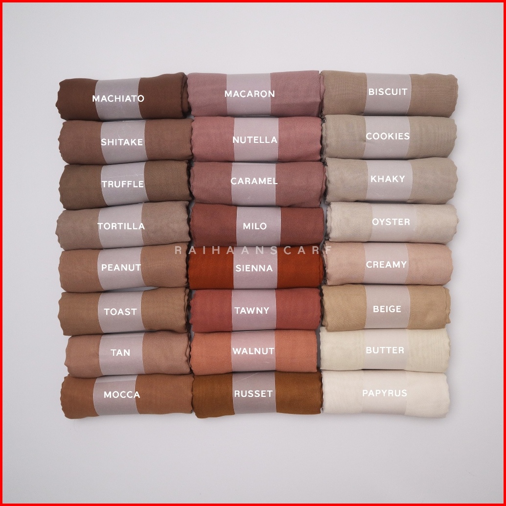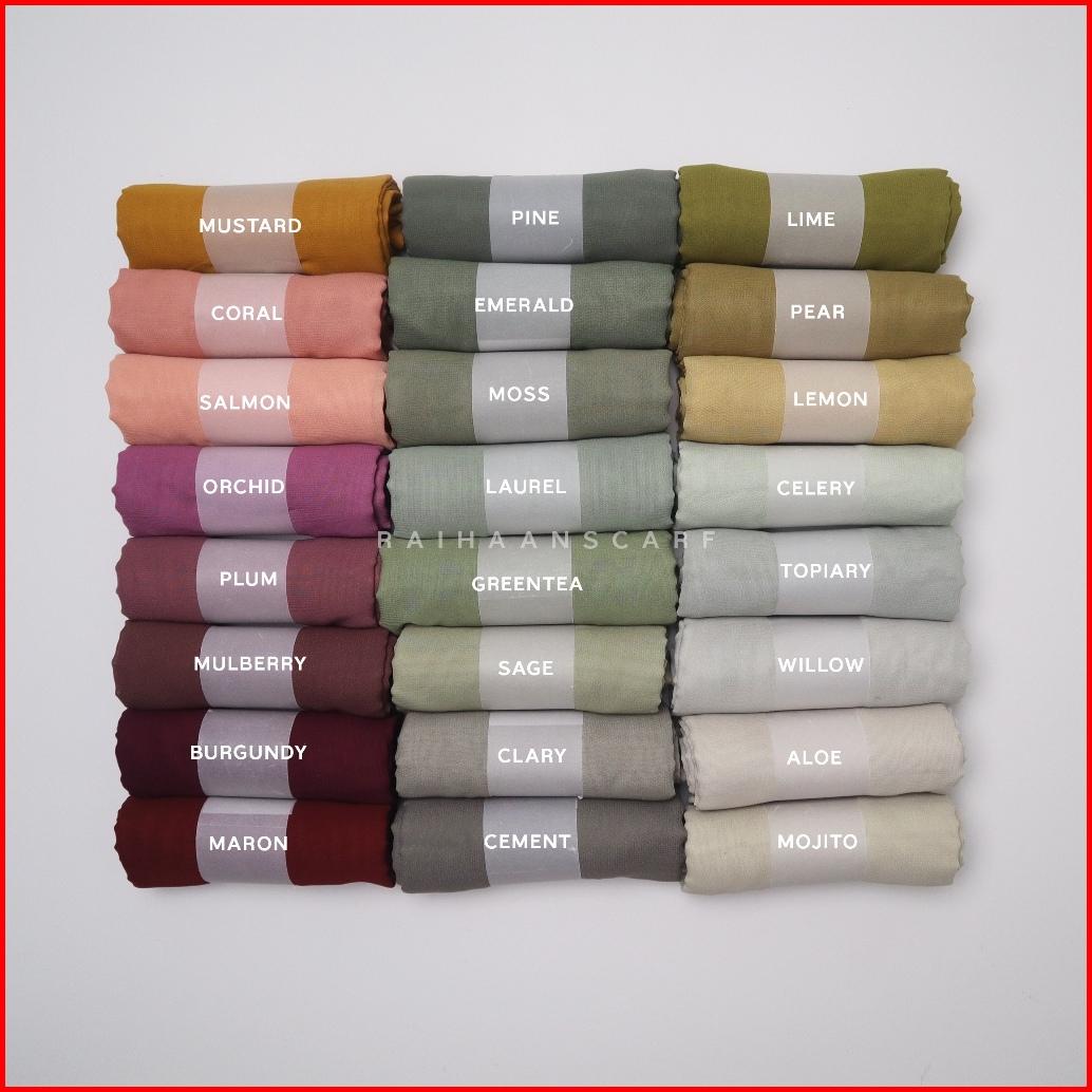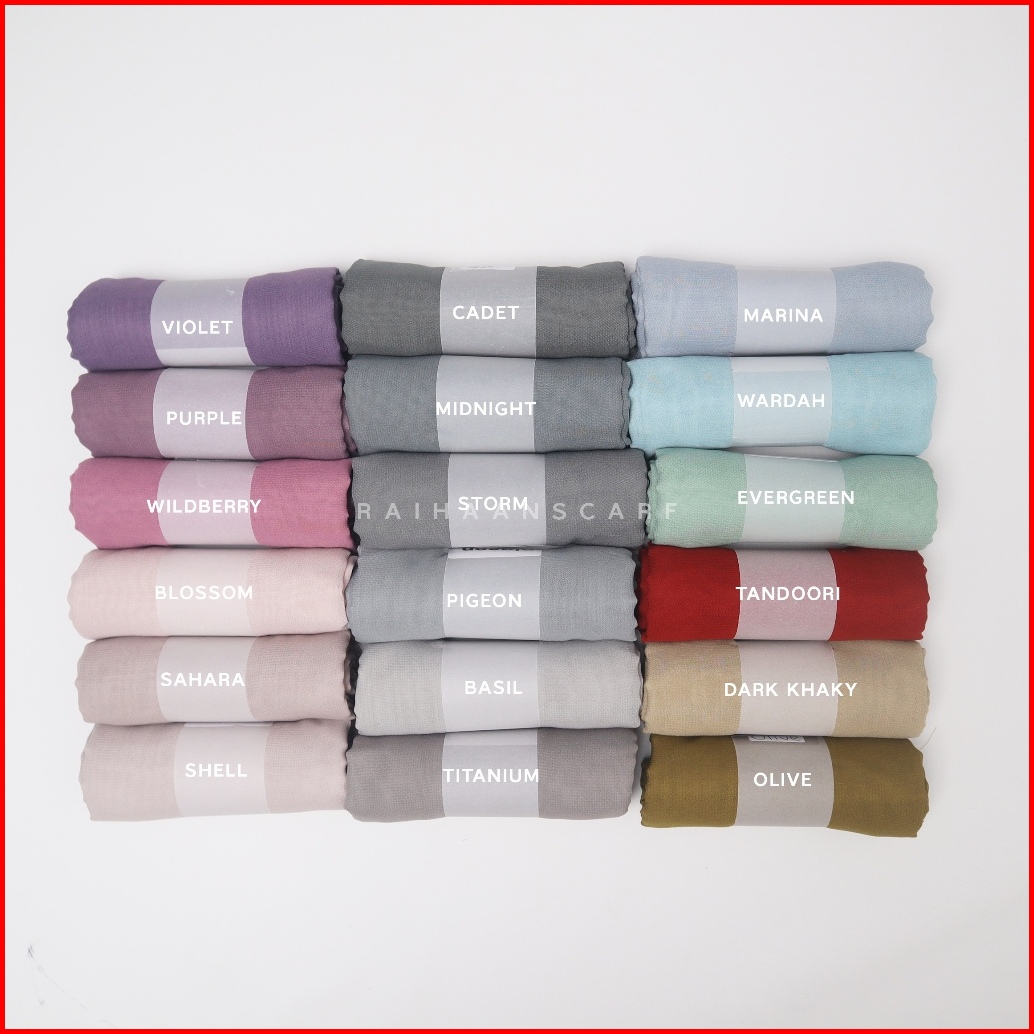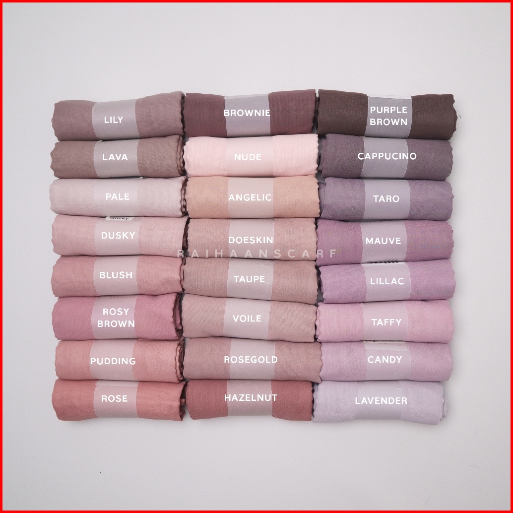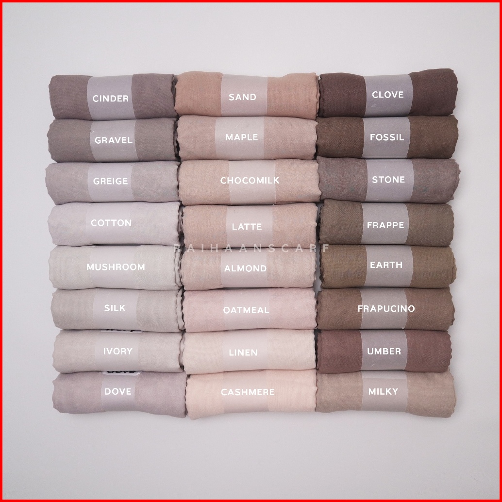 Silk, milky, Angelic, Nutella, clary, taro, willow, moss, taffy, lemon, coral, laurel, butter, cement, lava, dusky, candy, iceberg, breeze, frapucino, emerald, pale, gravel, powder blue, stone, ocean, chocomilk(new), tan, burgundy, salmon pink, voile, blush, rosegold, cinder, oyster, pear, cappucino, ash, cotton, mojito, cedar, pudding, jeans, latte, lily, Papyrus, Celery, Mulberry, flyway, arctic, umber, Topiary, Maple, Clove, Steel, Baby blue, Cloudy, Earth, Evergreen, macaron, lime, Mustard, Bottle, biscuit, hitam, Shitake, pine, russet, Greige, Sky, Almond, Tortilla, Doeskin, Khaky, Toast, Cashmere, Aloe, Mushroom, Linen, violet, olive, storm, pigeon, marina, sahara, blossom, titanium, Purple, Basil, Sheel, Dark Khaky, Wildberry, Tandoori, Sapphire, Wardah Blue, Cadet, Midnight, Charcoal, Teal, CHAT ADMIN