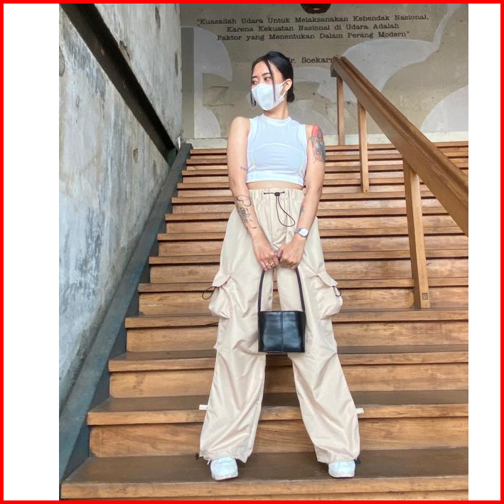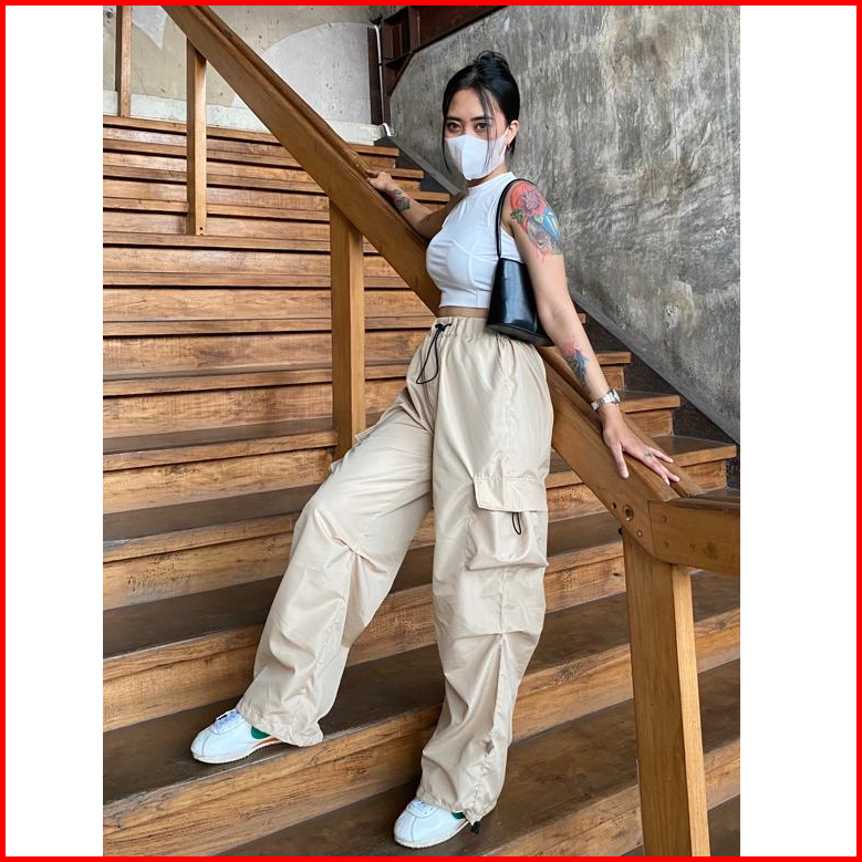 Aigo Zeil Cargo Pants - Celana Cargo Parasut Panjang Cream Streetwear Unisex