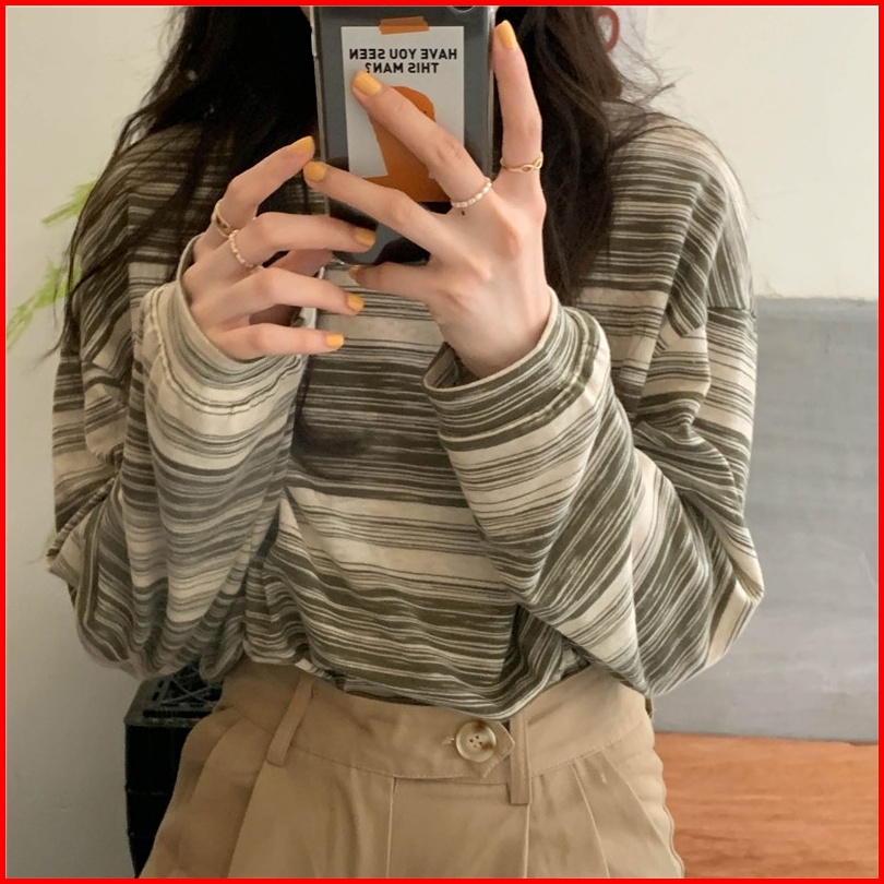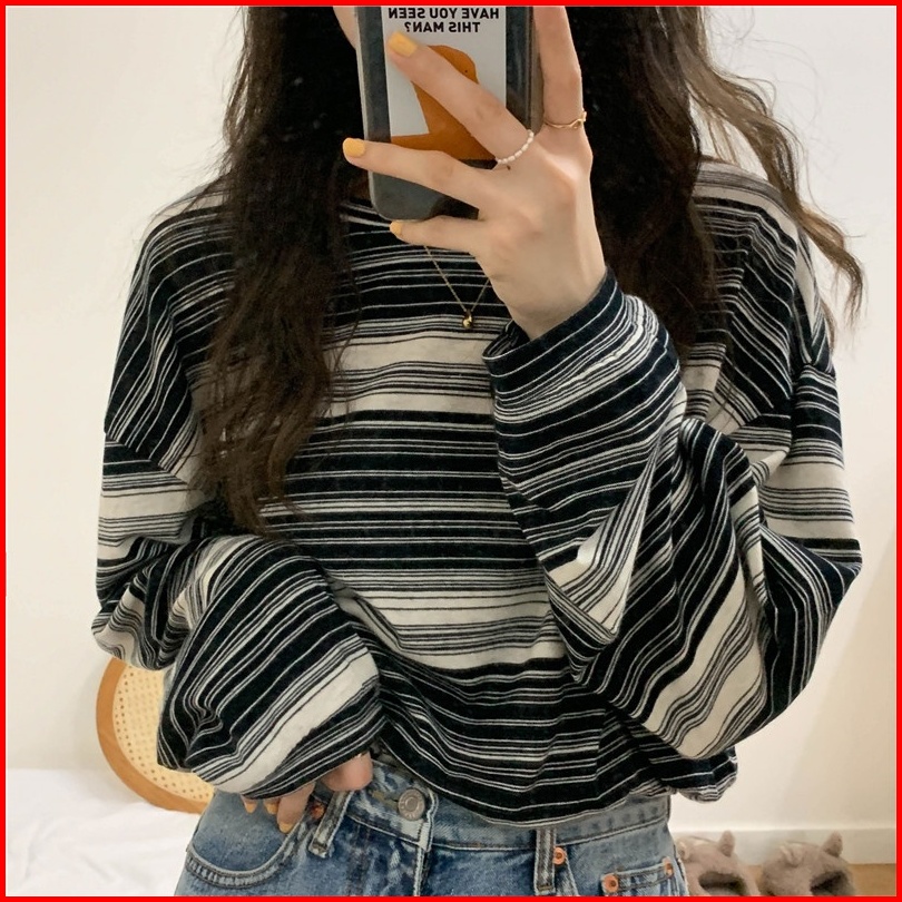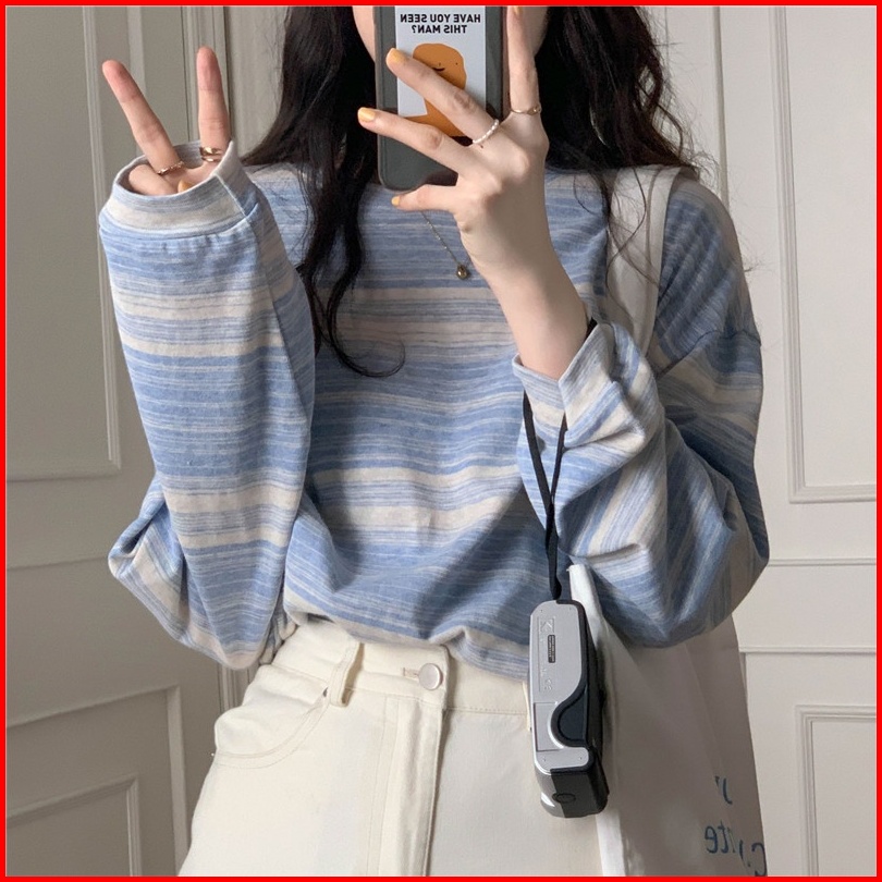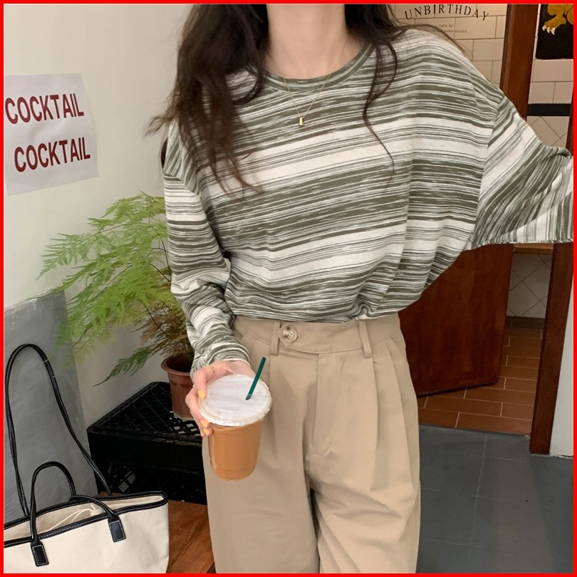 Yikoo-korea Kaos Wanita T Shirt Bergaris Atasan Lengan Panjang Top