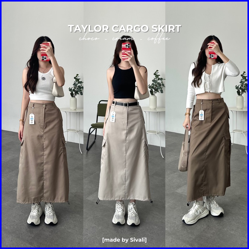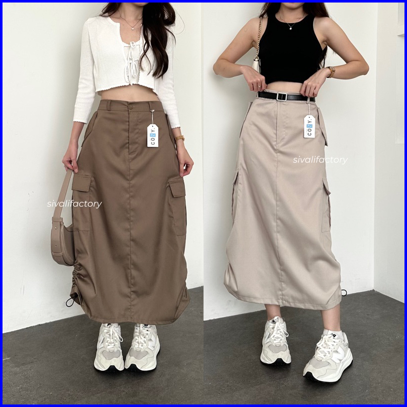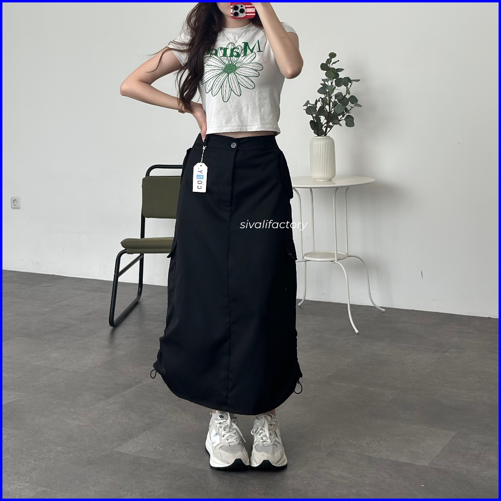 Sivali Taylor Cargo Skirt - Rok Kargo Serut Wanita Pocket Long Skirt Maxi Panjang