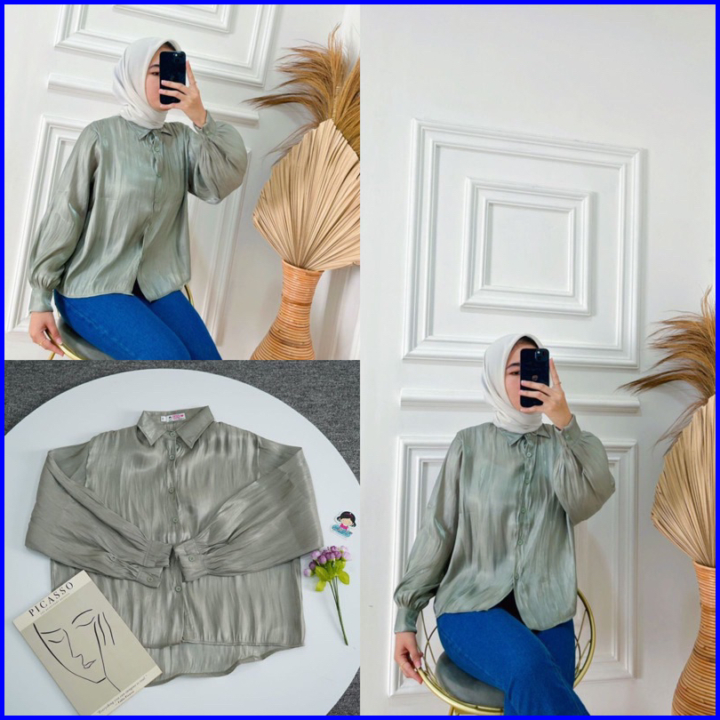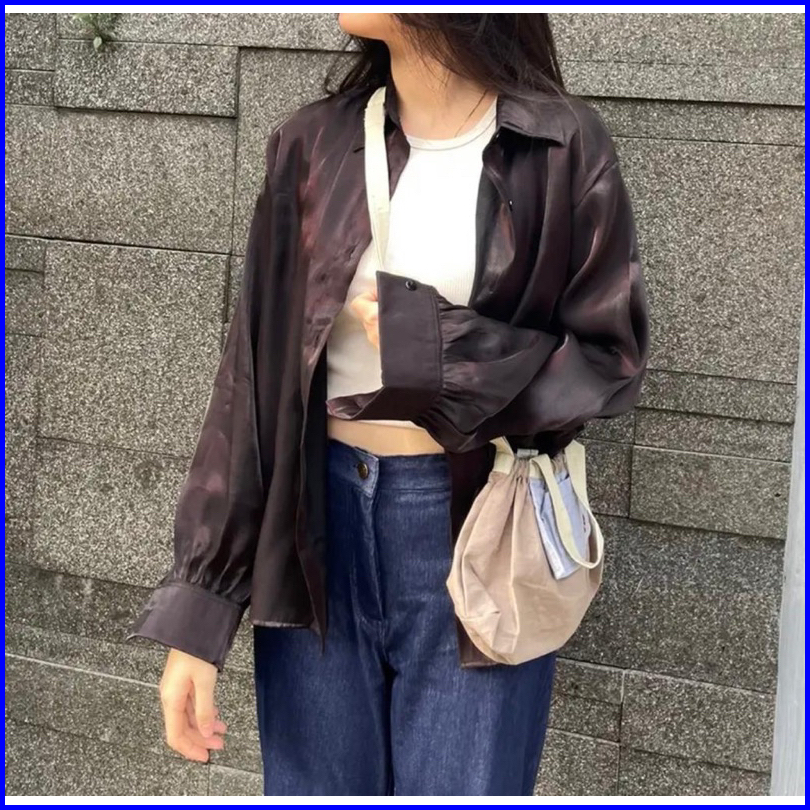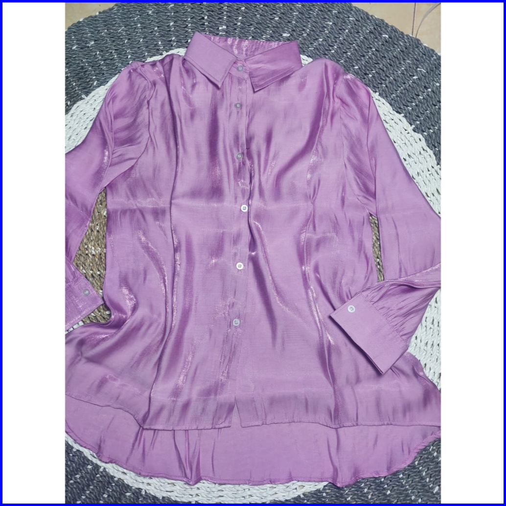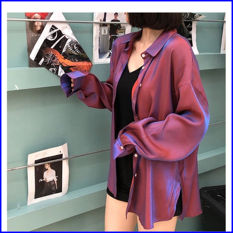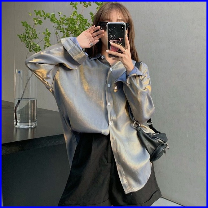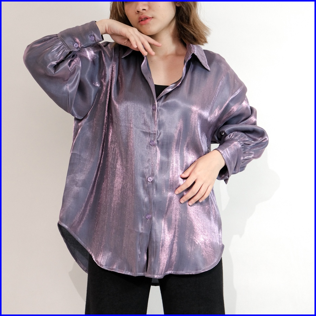 Kemeja Wanita Lengan Panjang Shimmer Silk Hologram Kemeja Satin Wanita Semi Transparan Kemeja Mengkilap Terlaris