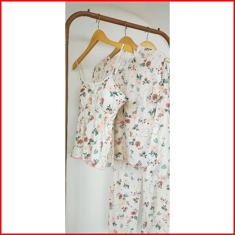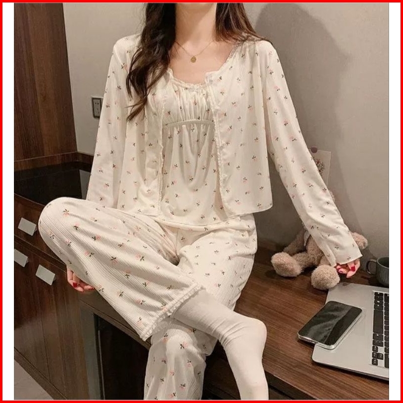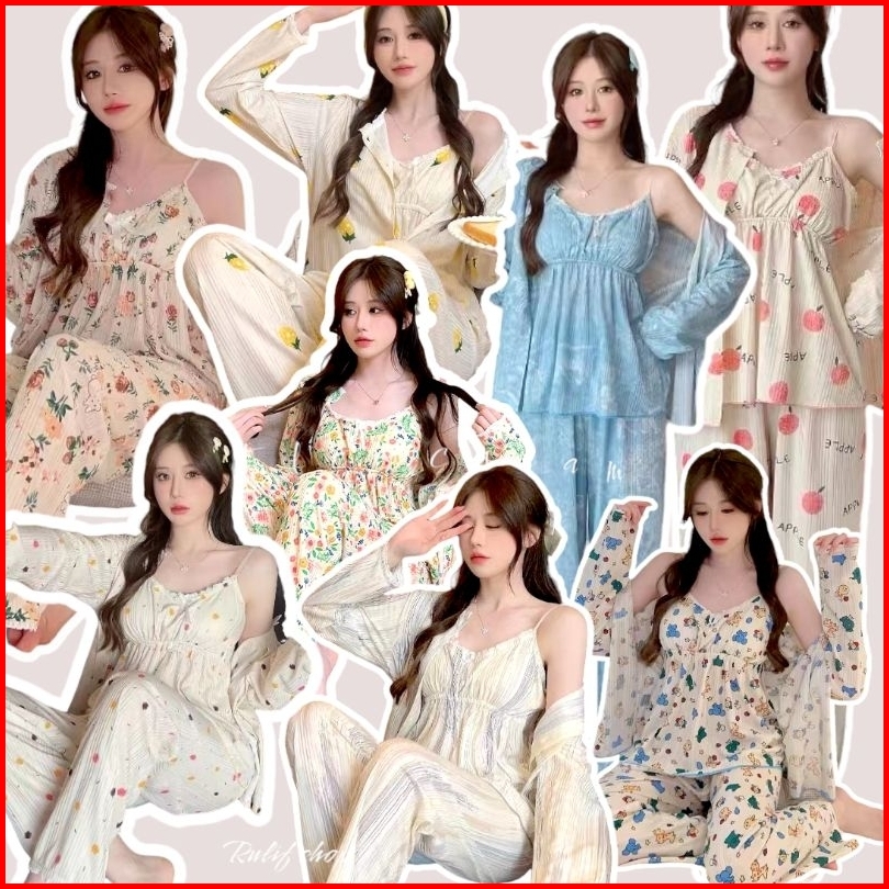 Rulif Baju Tidur Piyama Wanita Import 3in1 Setelan Kimono Lengan Panjang Premium Katun Flowcream Pp