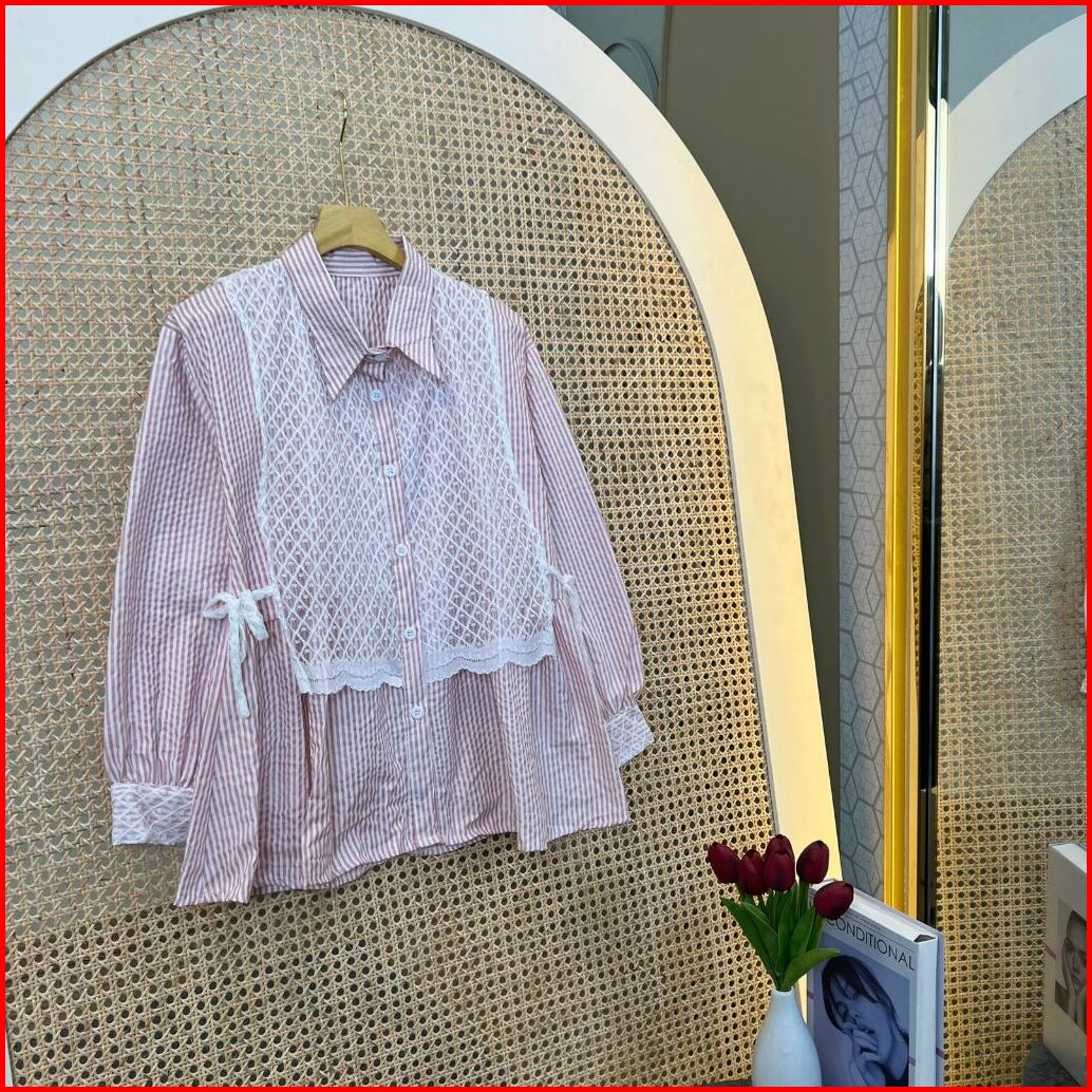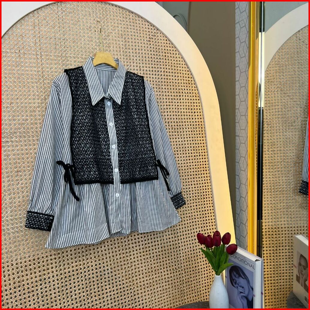 Arumi Blouse Salur Kombinasi Brukat Premium Kemeja Tangan Panjang Motif Stripe