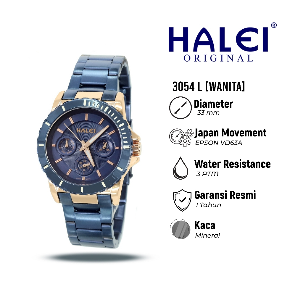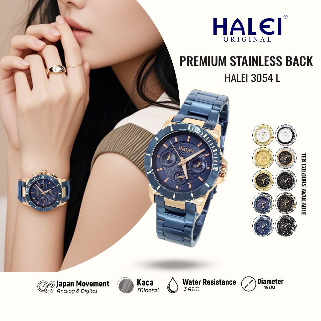 Halei 3054 L Jam Tangan Wanita Halei Original Anti Air Rantai Stainless Back Chrono Tanggal Analog