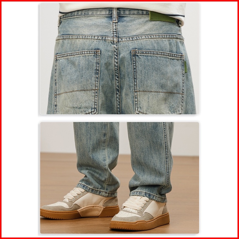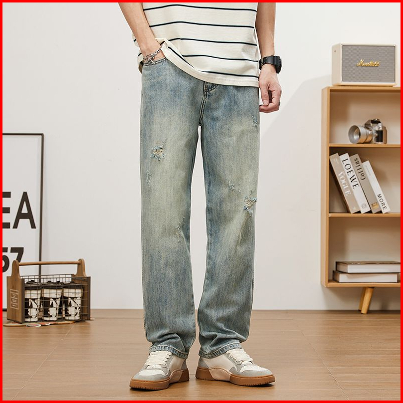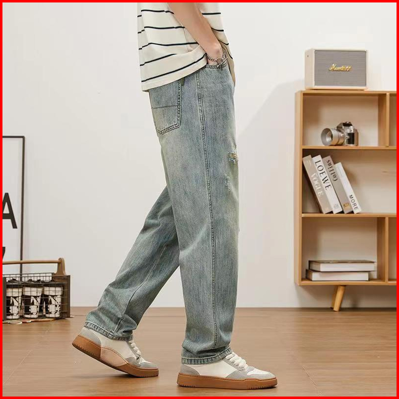 Celana Jeans Pria Sobek Biru Retro Baggy Pants Straight Jins Ripped Panjang Cowok Celana Denim Dewasa Laki Laki Loose Fi