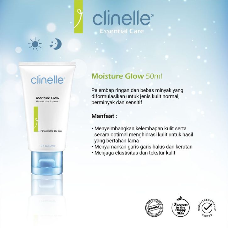 CLINELLE Moisture Glow 50 ml - Pelembap Wajah Ringan Bebas Minyak Untuk Kulit Berminyak / Kombinasi / Sensitif HA Plus