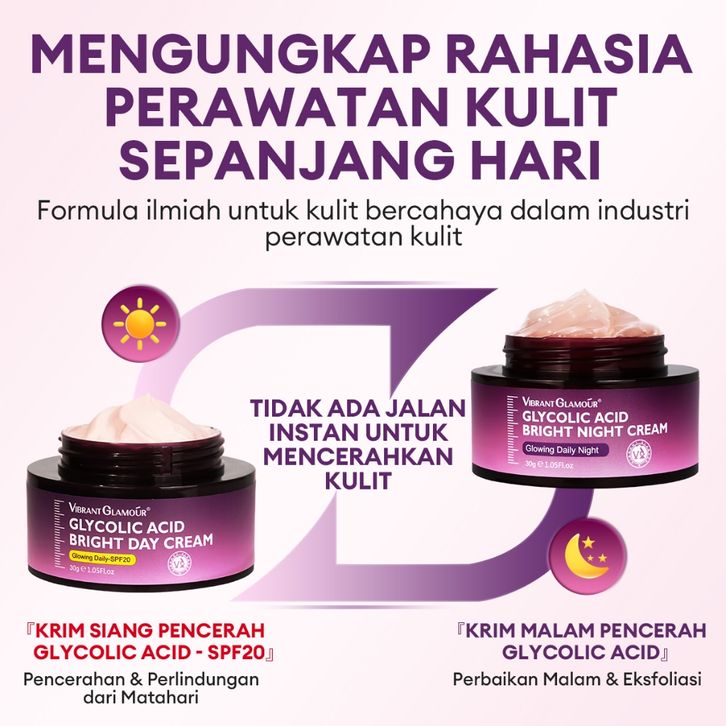 VIBRANT GLAMOUR GlyCOOLIc Acid Siang/Malam Cream 2pcs, Siang: memutihkan dan melindungi dari sinar matahari + malam: pe