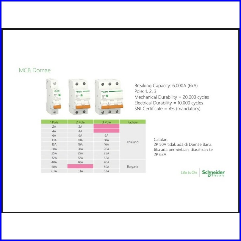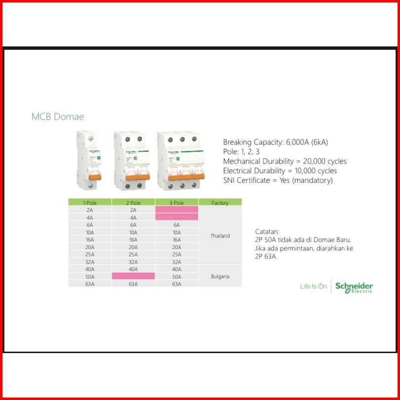 Mcb Schneider Mcb Domae 6ka 1 Pas 1 Phase 1p 2a 4a 6a 10a 16a 20a 25a 32a 40a 50a 63a