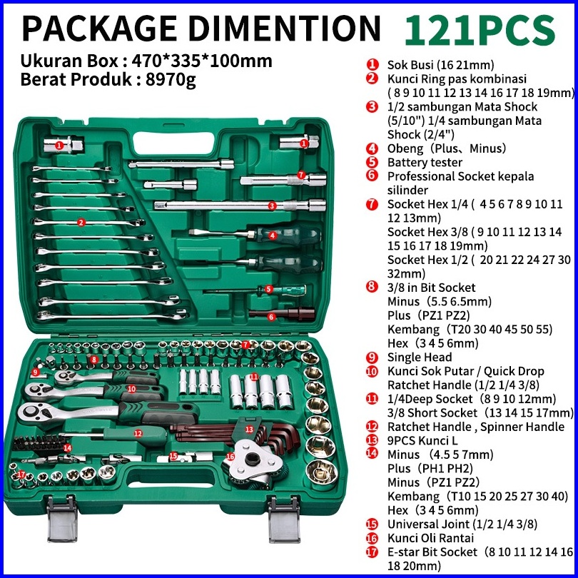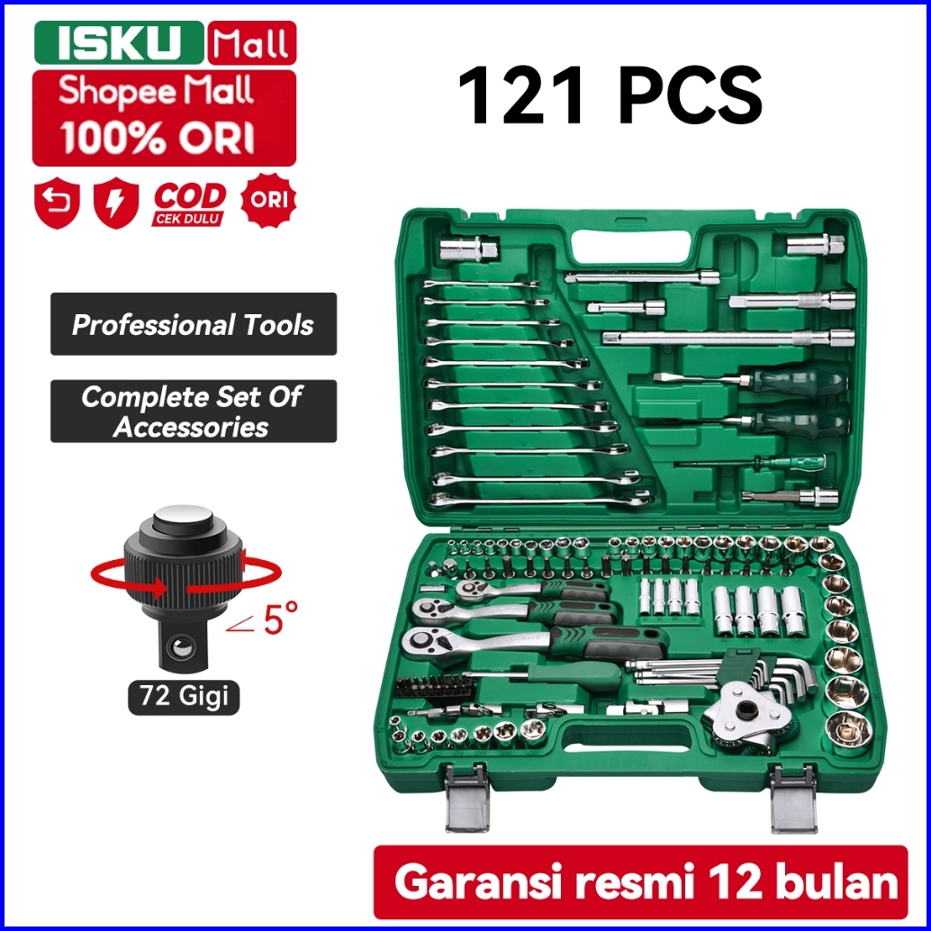 Isku Tools Set 121pcs 72gigi Kunci Shock Set Lengkap Kombinasi Termasuk 1 Set Kunci Pas Ratchet Lengkap 72gigi 1 2 1 4 3