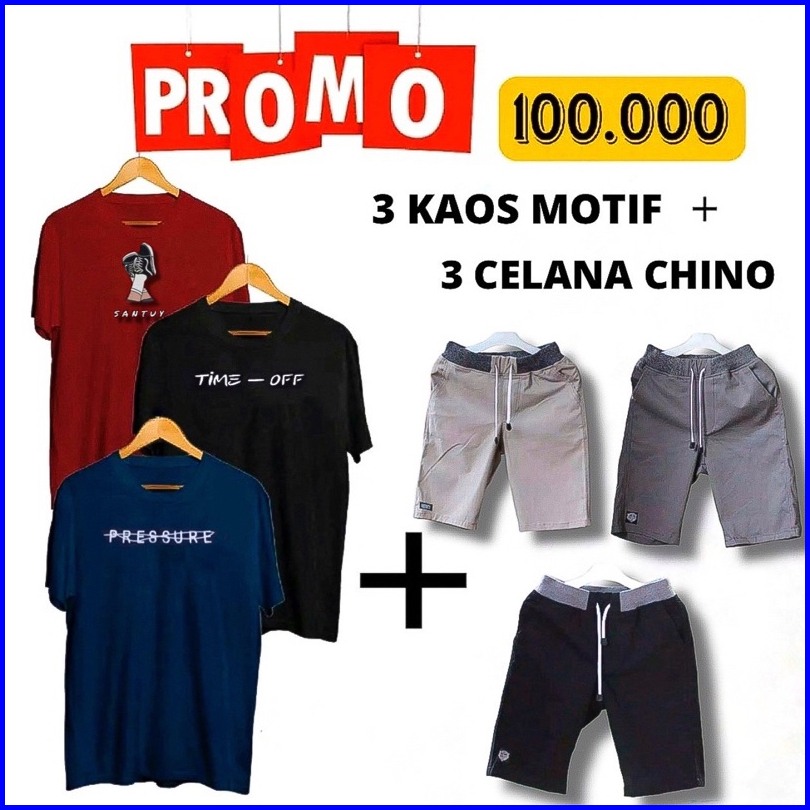 Paket Hemat 100rb Dapat 3 Kaos 3 Celana Pendek Chinos Pria Dan Wanita