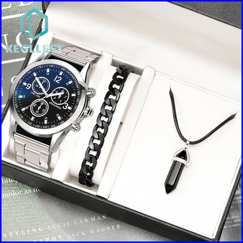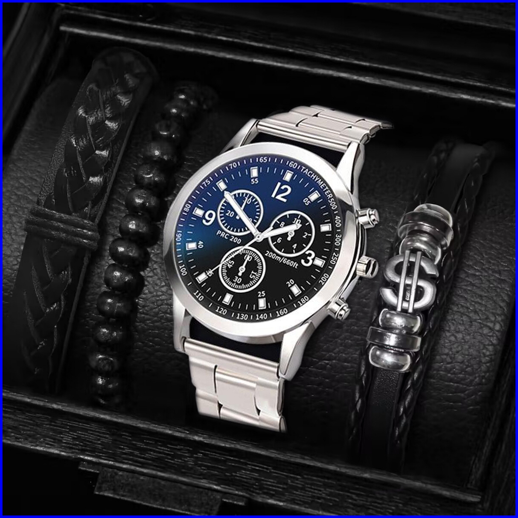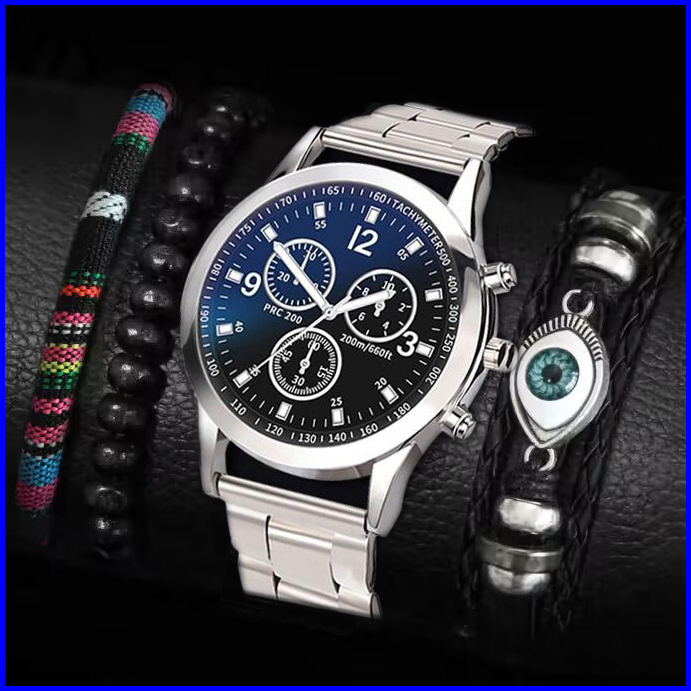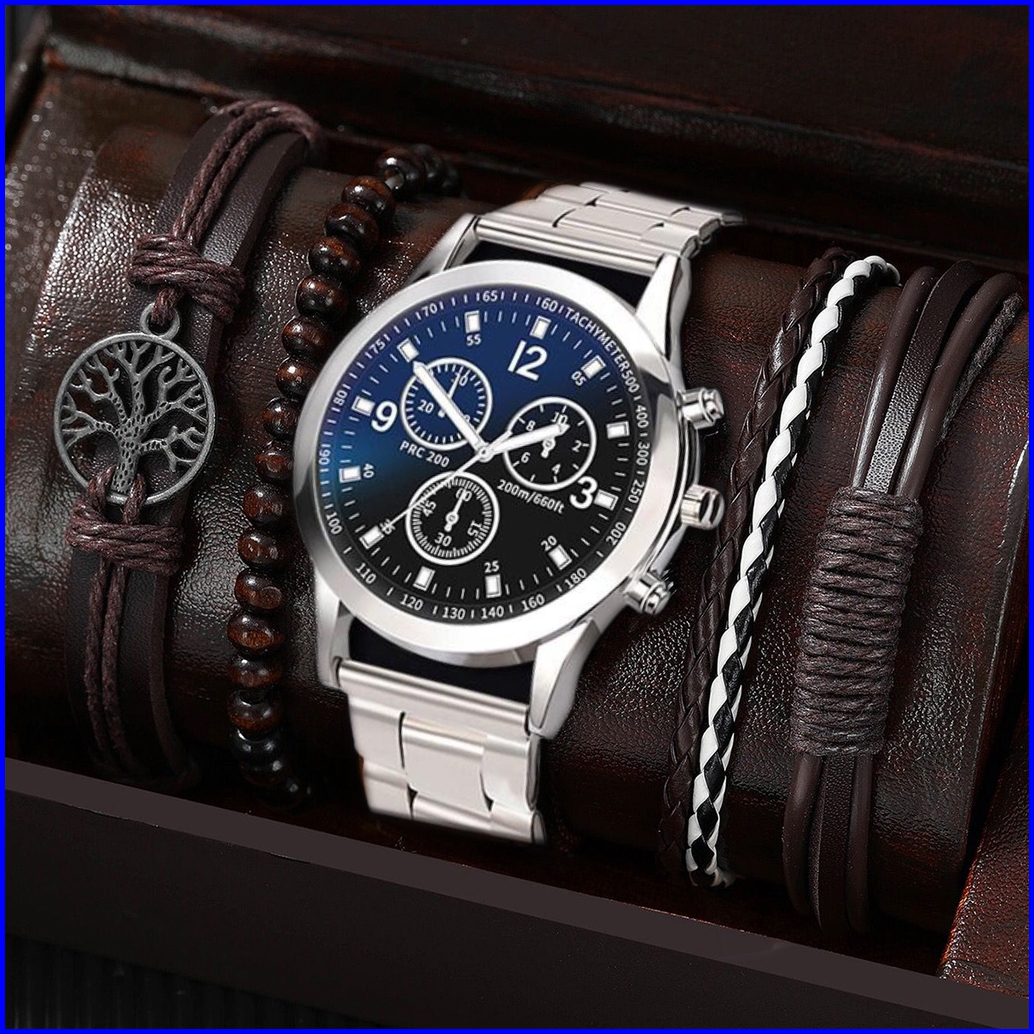 Jam Tangan Kuarsa Gaya Bisnis Pria Tali Baja Tahan Karat Dial Besar Dengan Aksesori 5 Set