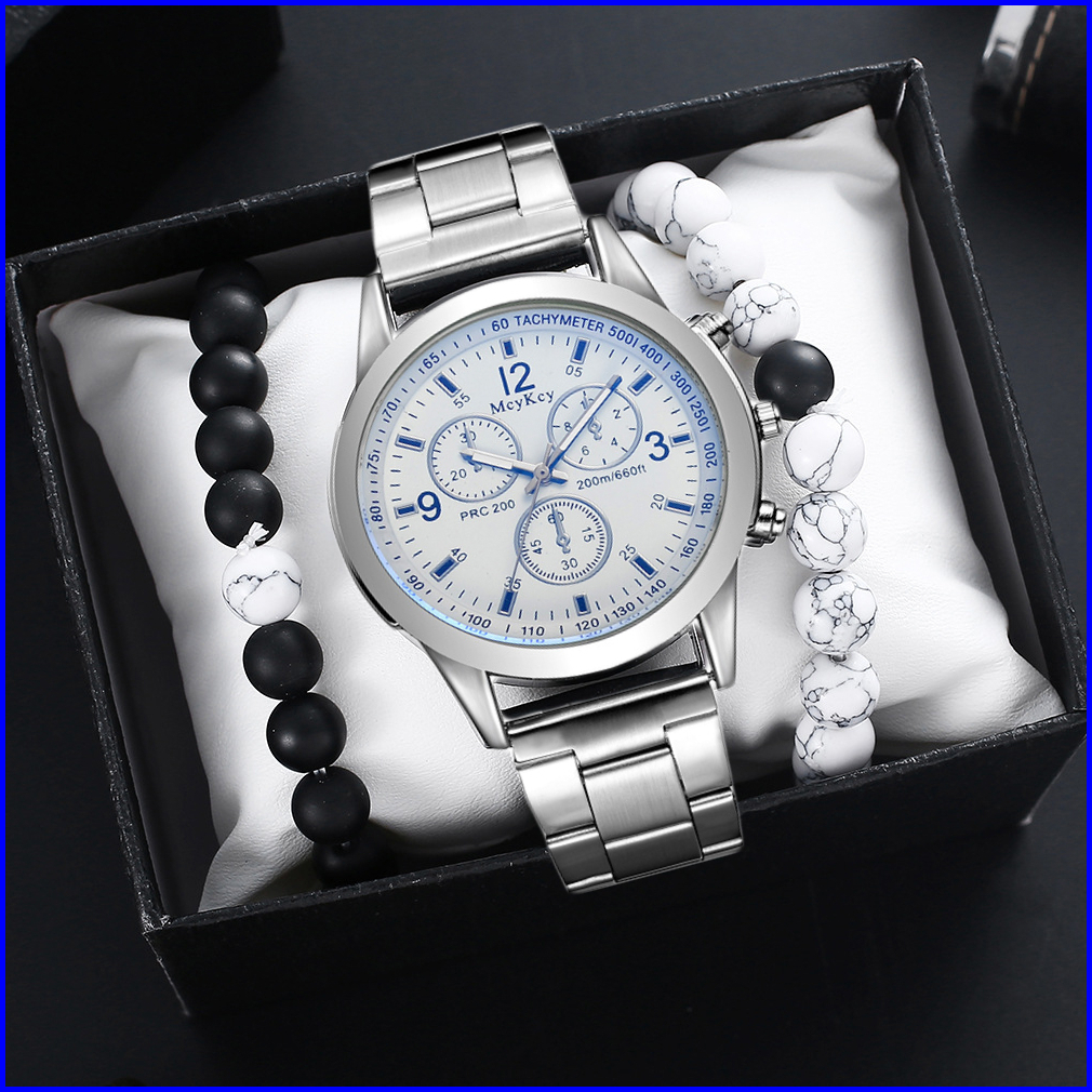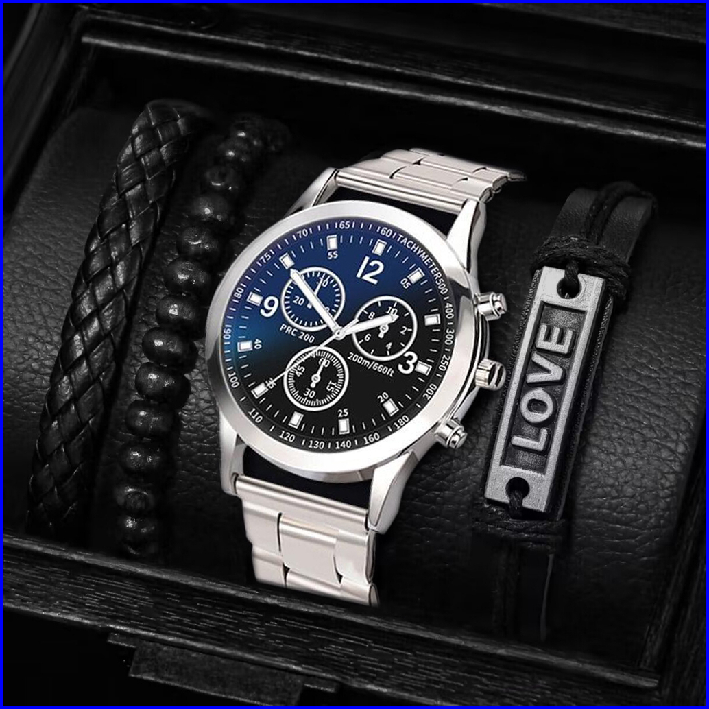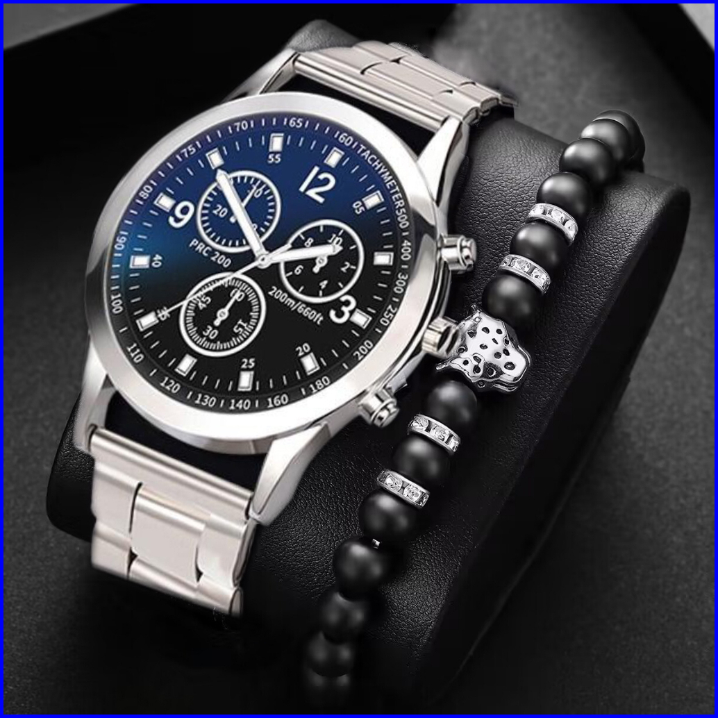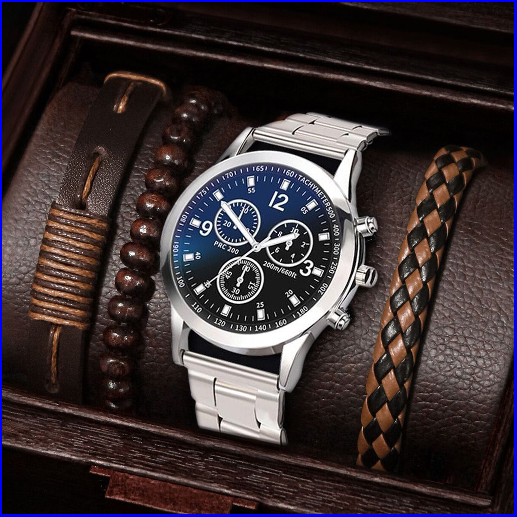 Jam Tangan Kuarsa Gaya Bisnis Pria Tali Baja Tahan Karat Dial Besar Dengan Aksesori 5 Set