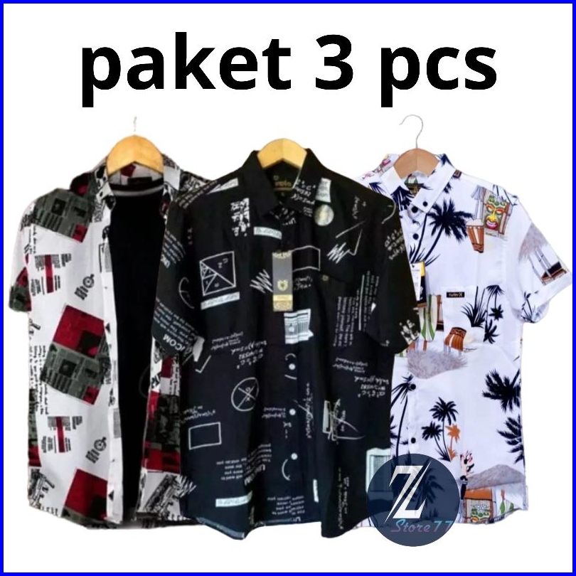 Paket 3 Pcs Kemeja Motif Pantai Hem Motif Lengan Pendek Baju Surfing Pria Original Distro Premium Casual Full Printing