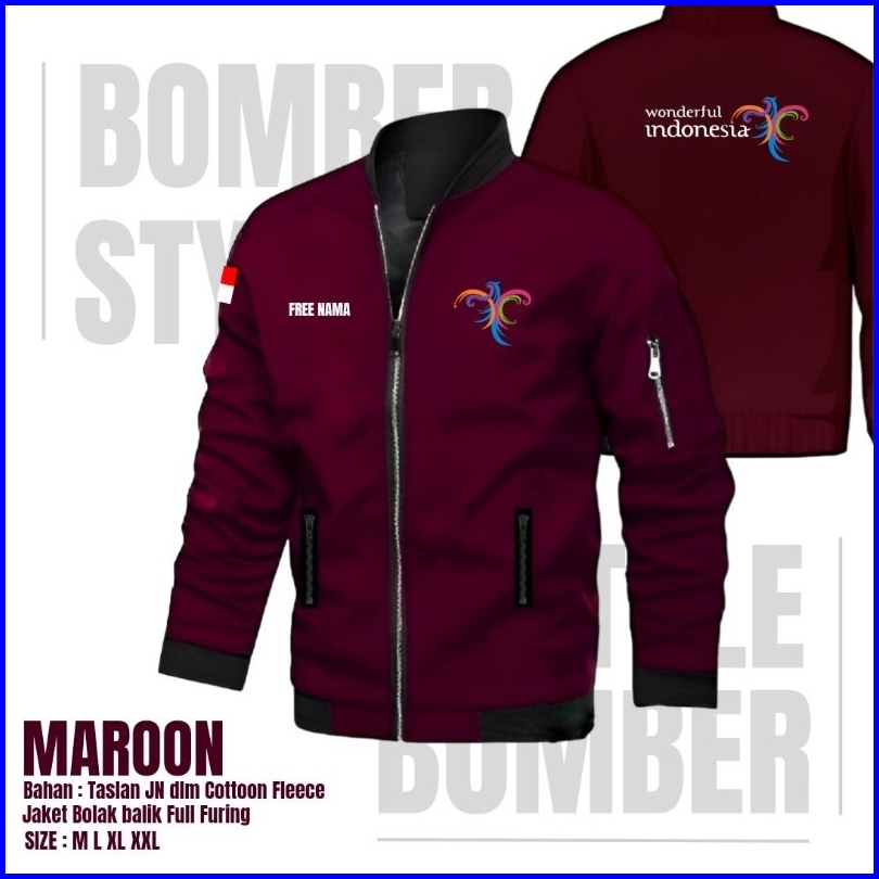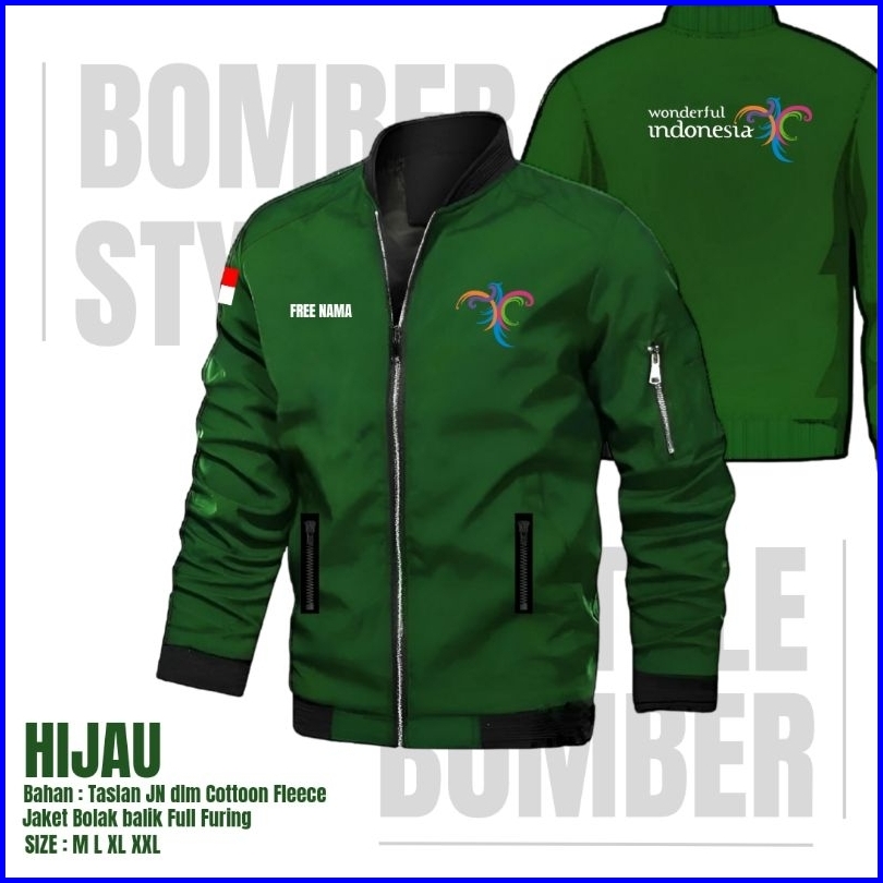 Jaket Bomber Pariwisata Free Nama Wonderful Indonesia Waterproof Outdoor Pria Wanita Bolak Balik Distro Motor Gunung Tad