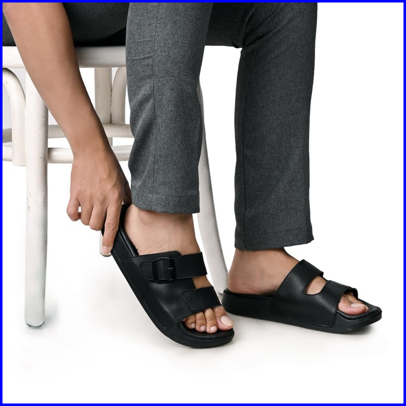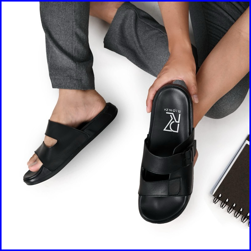 Rionz Figo Black - Sendal Pria Casual Slide Hitam Slop Kulit Sintetis