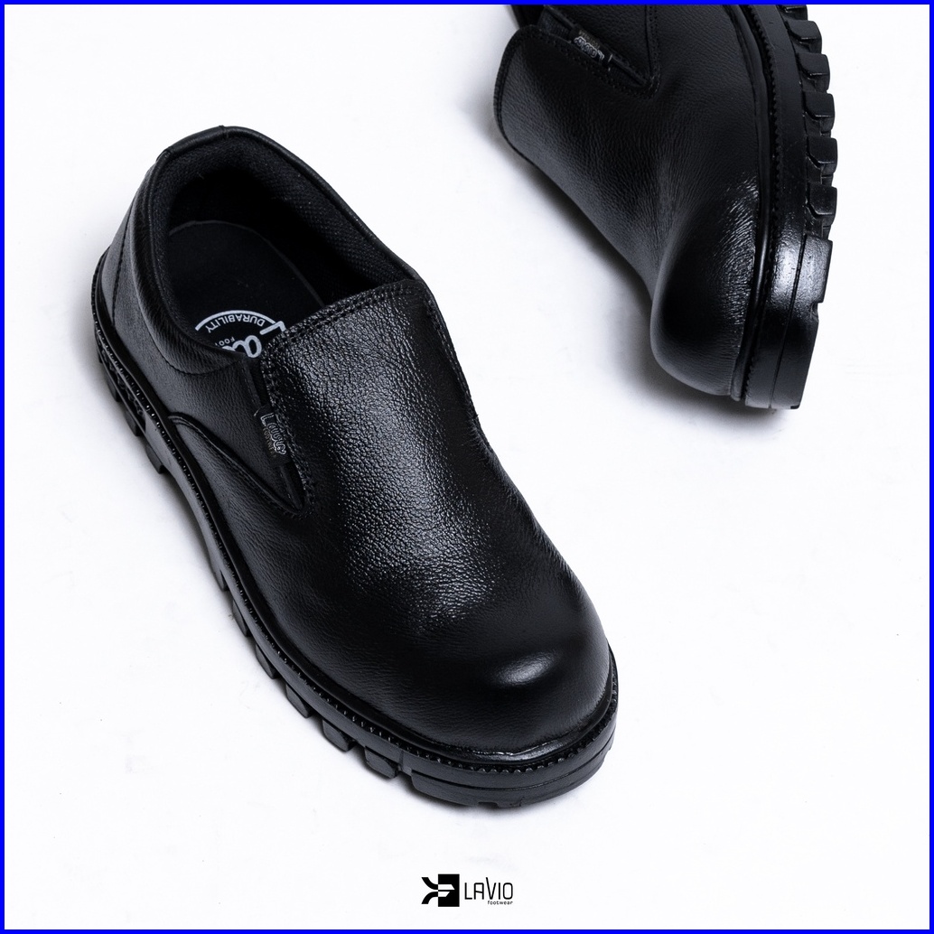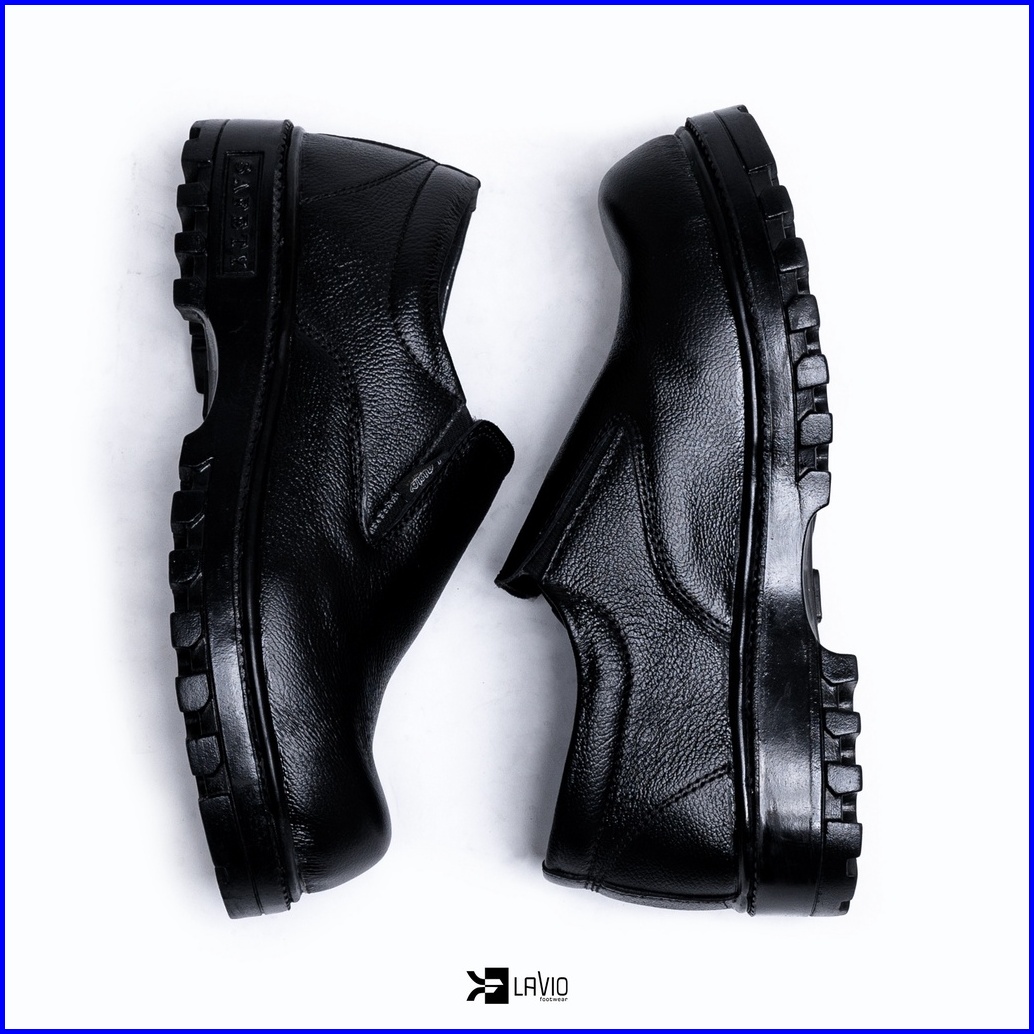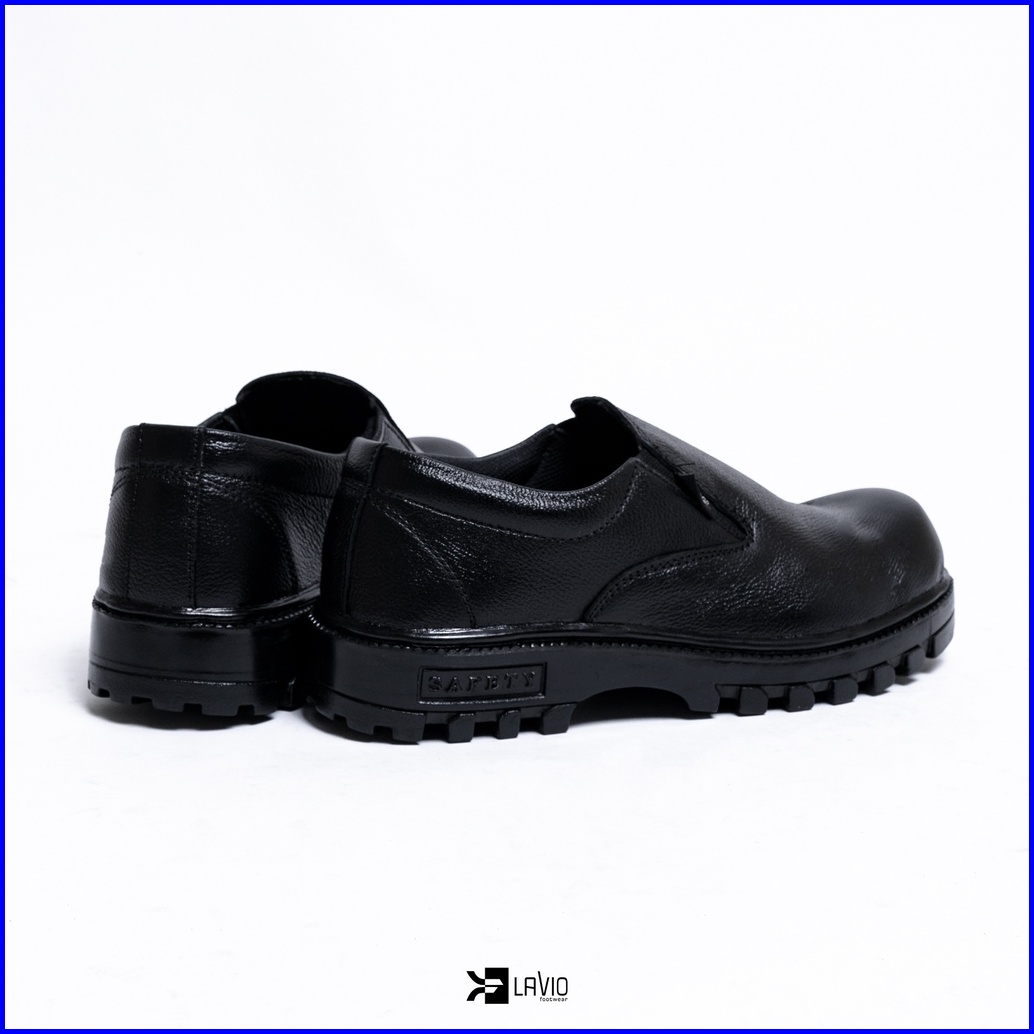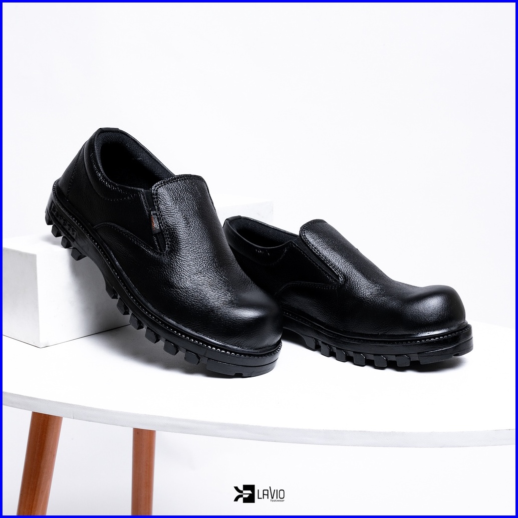 Lavio Sepatu Safety Proyek Bangunan Jalan Kuat Garansi Original Boots Hitam Original Slop Tanpa Tali Ujung Besi Kulit As