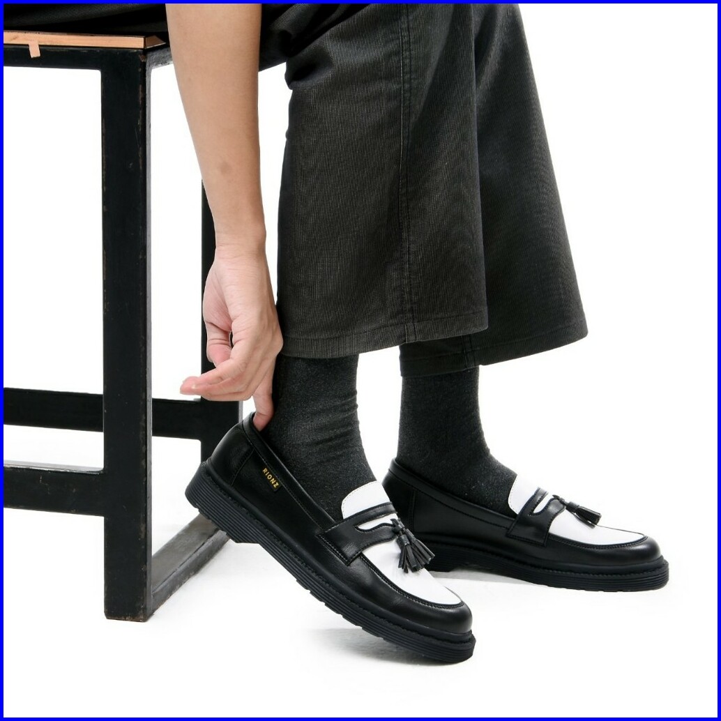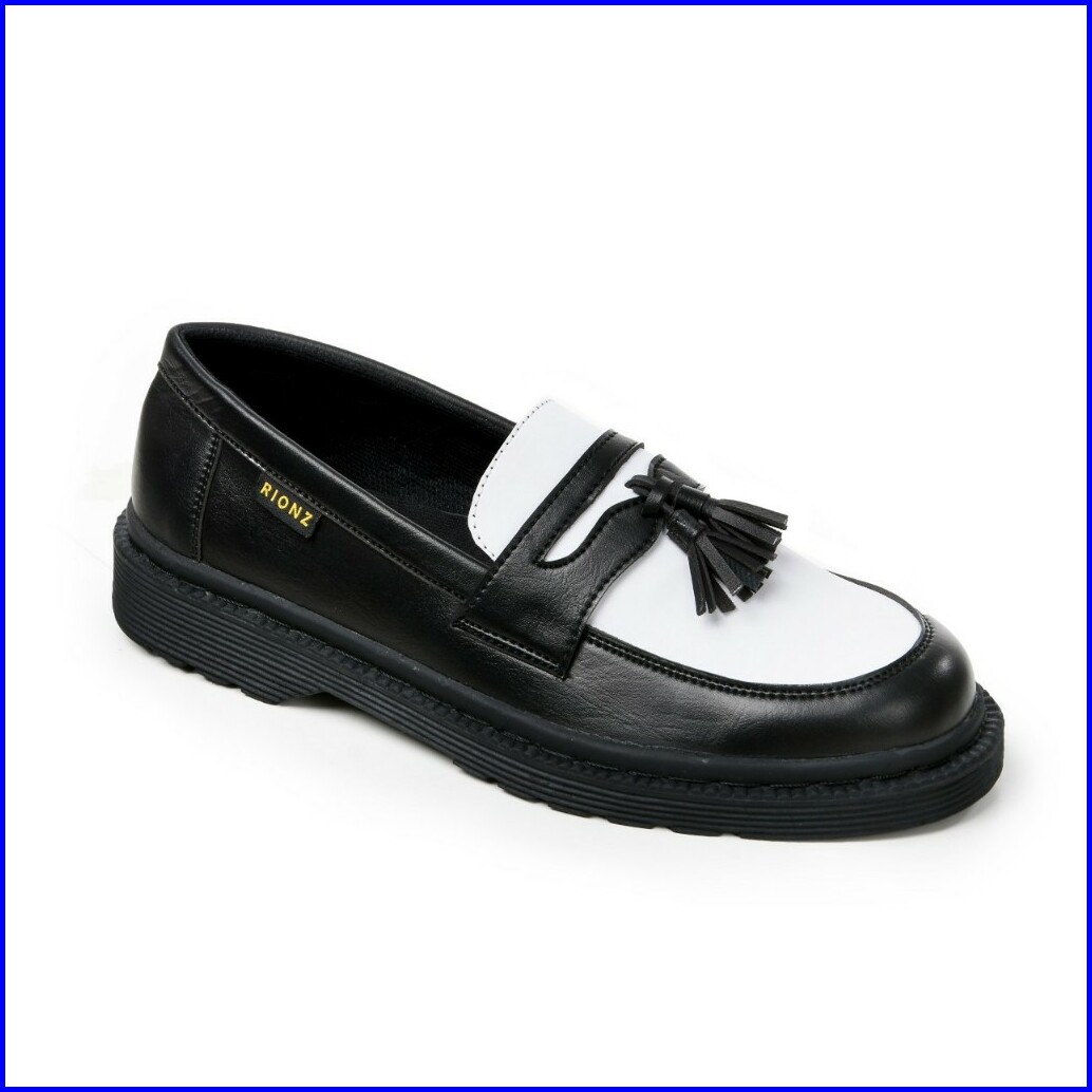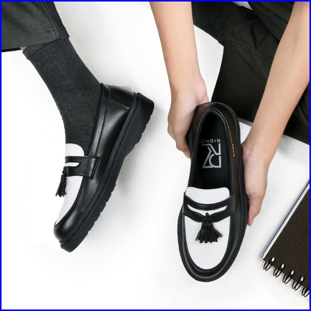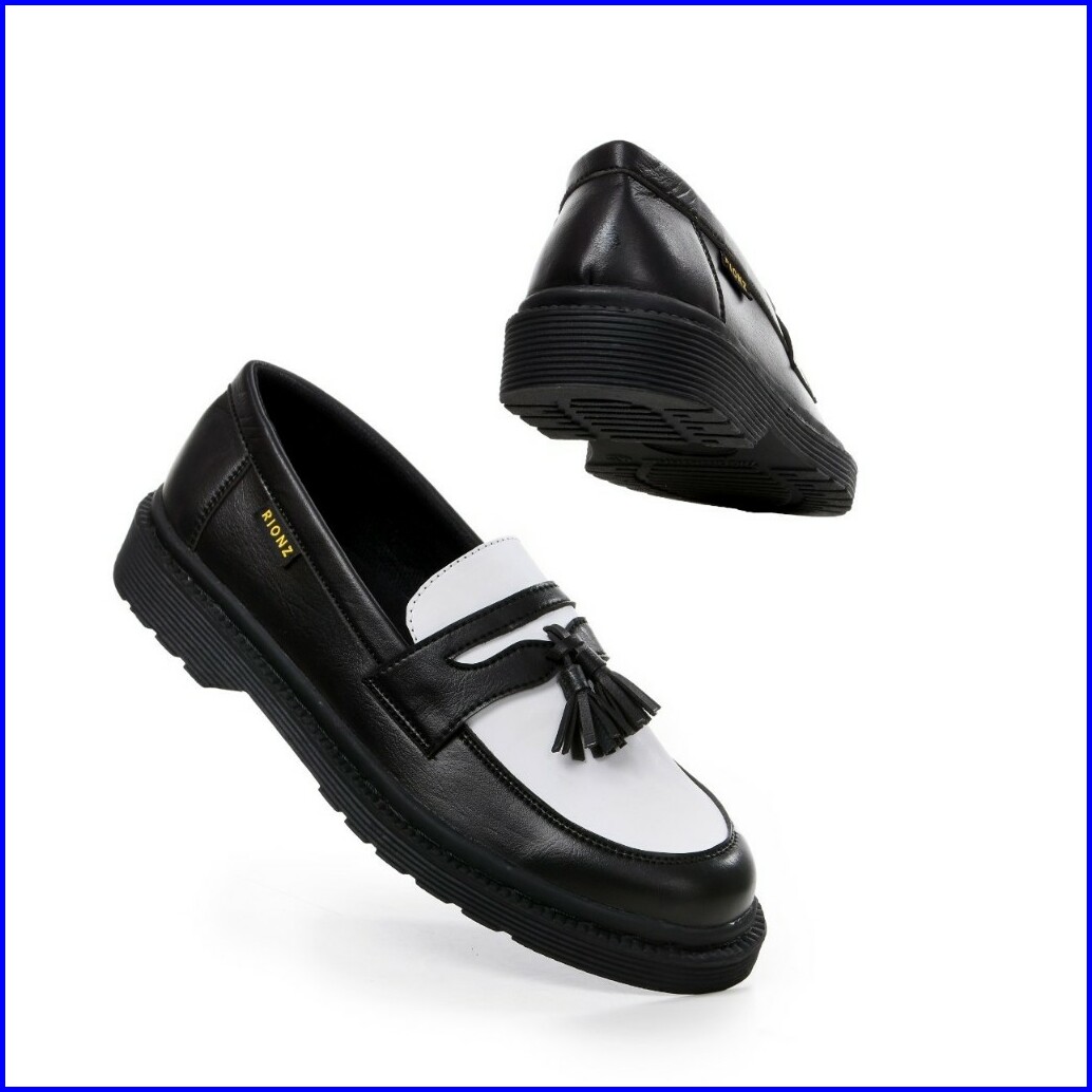 Rionz Polin 02 Black White - Sepatu Loafer Pria Formal Kantor Casual Kulit Pu