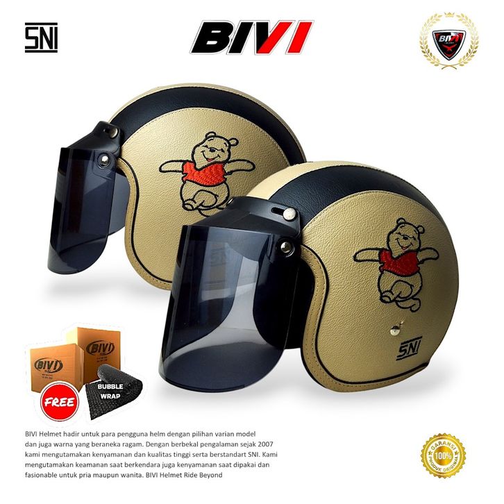 BIVI Helm Bogo Full Kulit Bordir Motif Bear SNI Retro Half Face Pria Wanita Hijab Dewasa