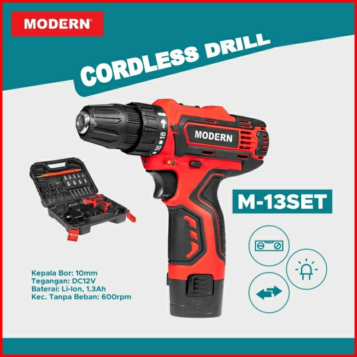 Mesin Bor Baterai Cordless 12 Volt Modern Cordless Drill M-13 Set