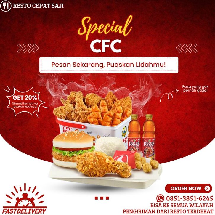 Paket Family, Combo Favorit, Super 5, CFC Boks Combo, CFC Boks, Astaga 5, Astaga 4, Astaga 3, Astaga 2, Astaga 1, Sensasi 1, Sensasi 2, Fun Family 1, Fun Family 2, Toy Ala Carte, Hebat A, Hebat B, Hebat C, Hebat D, 4 Menu, 3 Ayam, 5 Ayam, 7 Ayam, CFC Boks + Pilih Sendiri Gratisanmu, CFC Boks Combo + Pilih Sendiri Gratisanmu, Fun Meal 1, Fun Meal 2, Fun Meal 3, Chicken Marinara Ricebowl, Chicken Stick, Baso Goreng, Samyang Ricebowl, Paket Samyang Ricebowl, Fish Skin, Rame Ber-2, Rame Ber-3, Rame Ber-4, Monday Deal 1, Monday Deal 2, Sambal Geprek, Sambal Terasi, Sambal Hijau, Sambal Warisan, Paha Bawah, Sayap, Paha Atas, Dada, Chicken Kranz, Chicken Strips (3 Pcs), Chicken Pop (9 Pcs), California Cheese Burger, California Burger, French Fries, Rice, Perkedel, Onion Ring, Cheesy Fries, Mix Combo B, Mix Combo A, Le Minerale 330 ML, Coca-Cola PET 250 ML, Teh Pucuk Harum 350 ML, Thai Tea, Kopi Susu Gula Aren, Es Coklat