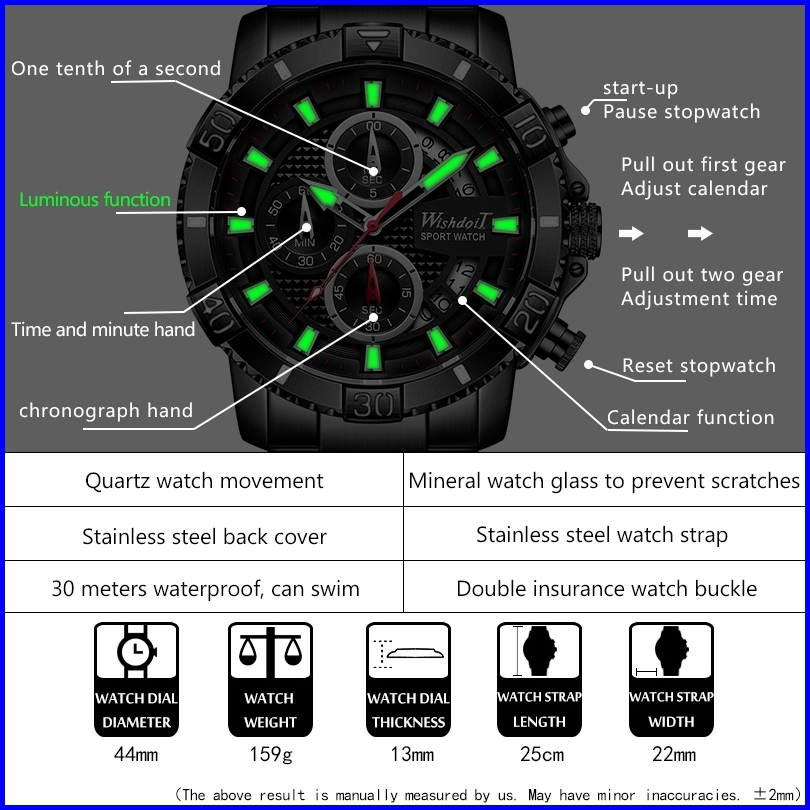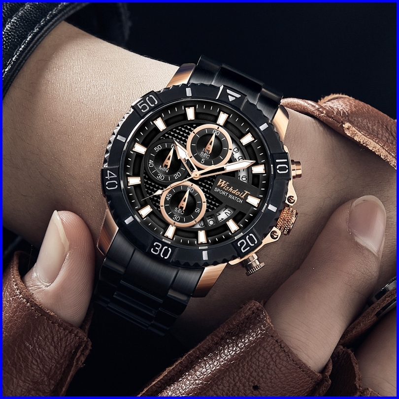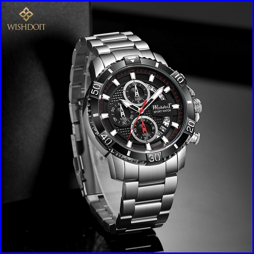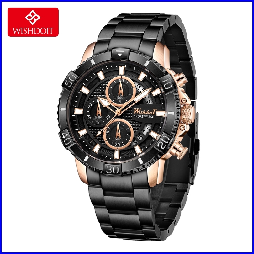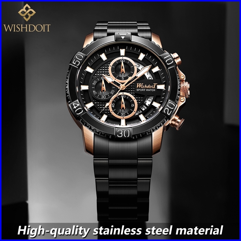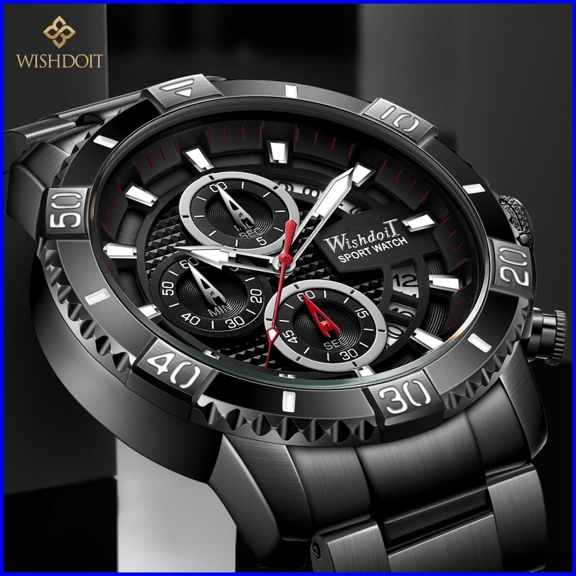 Wishdoit Jam Tangan Pria Asli Anti Air Keren Mewah Bisnis Kalender Analog Baja Tahan Karat Chronograph Jam Tangan Hitam