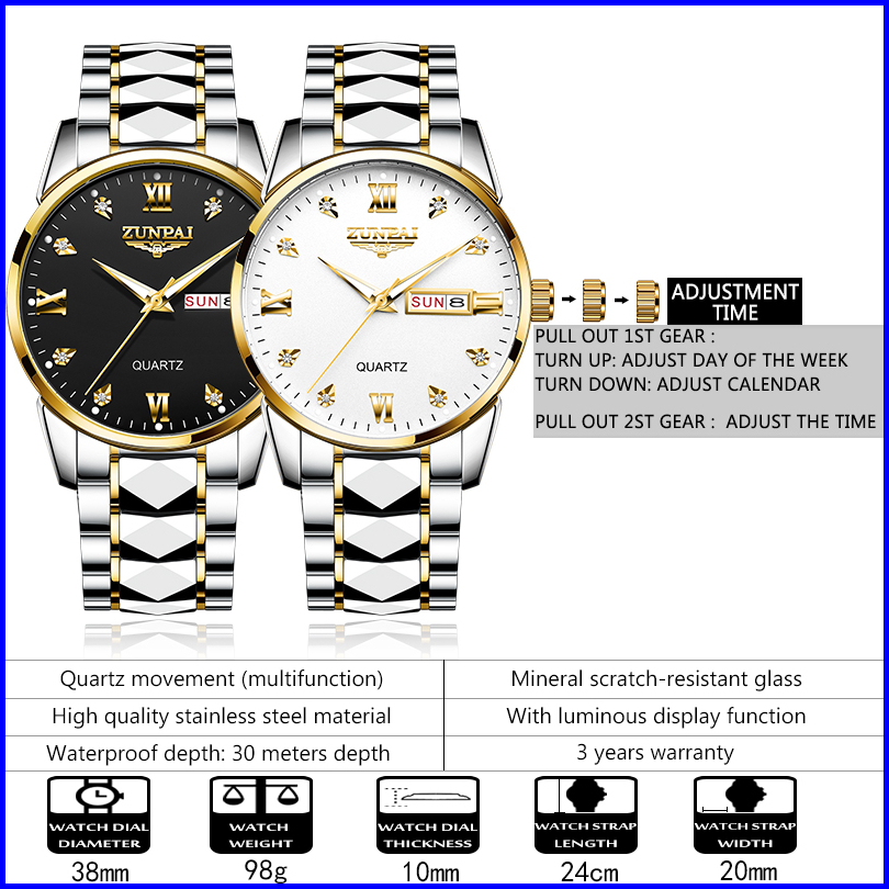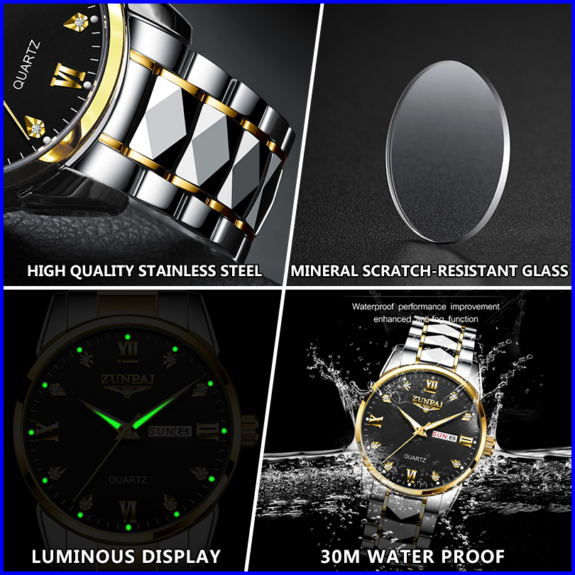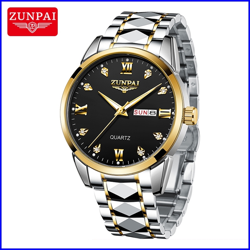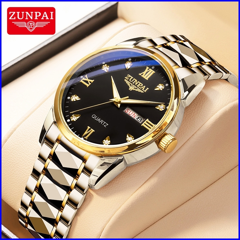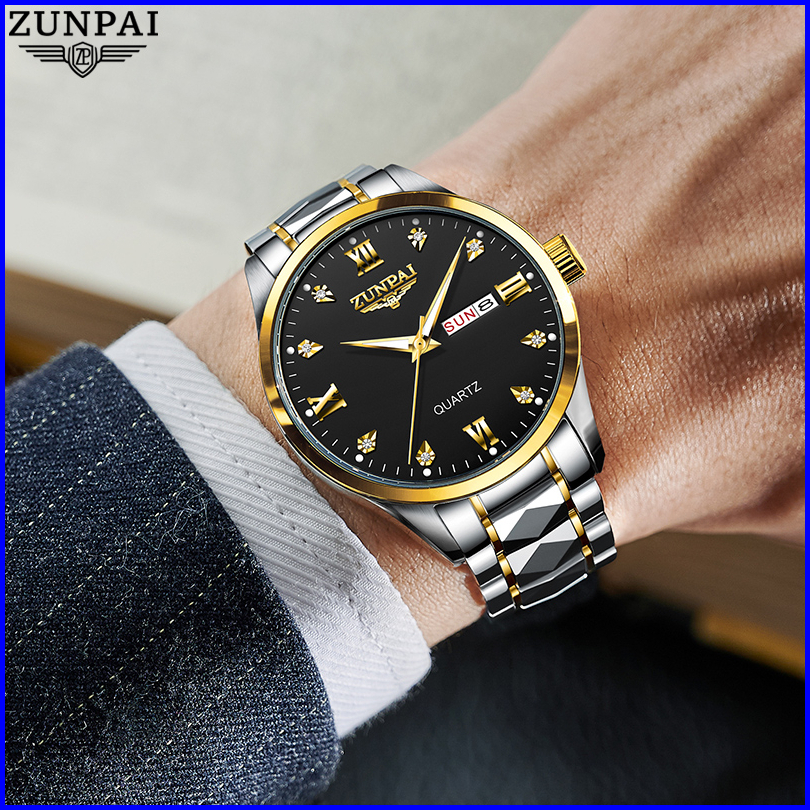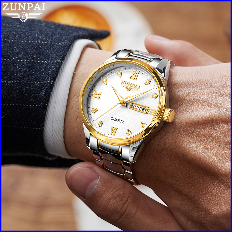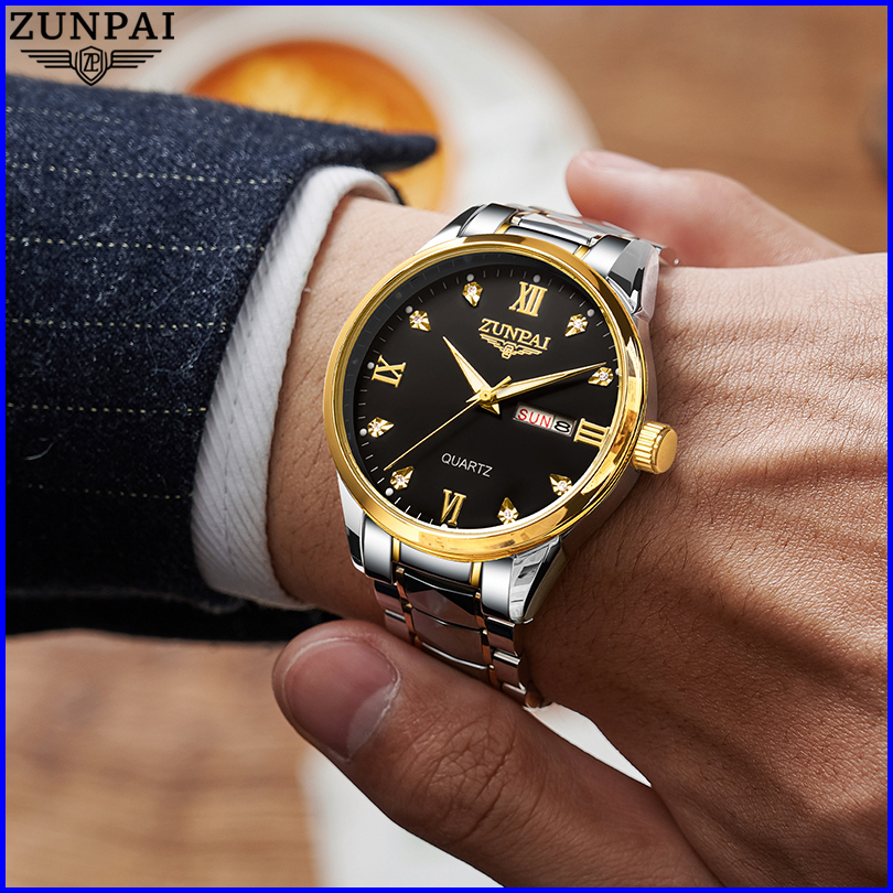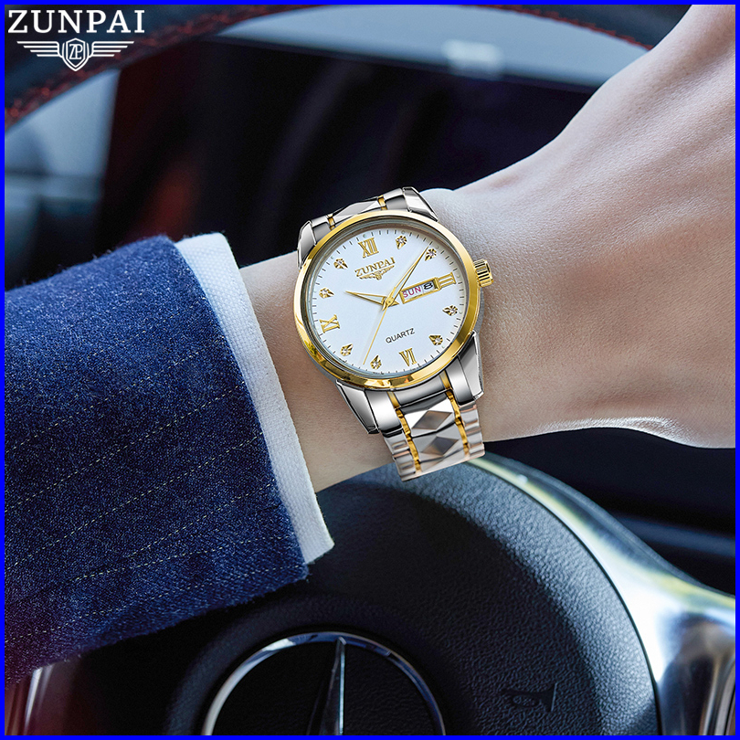 Zunpai Jam Tangan Pria Anti Air Asli Baja Tahan Karat Chronograph Aktivitas Kalender Bercahaya Jam Tangan Analog Pria