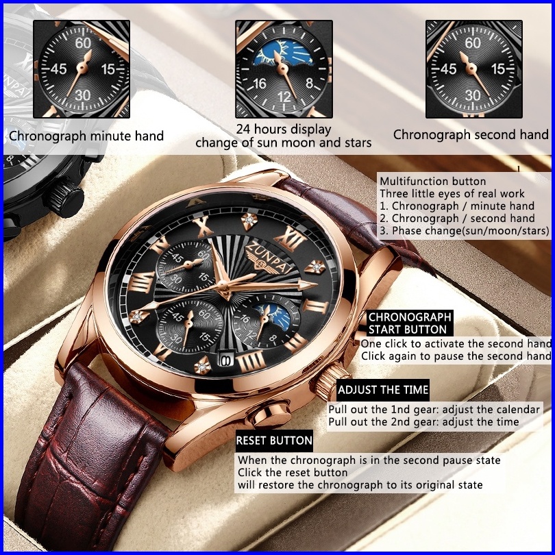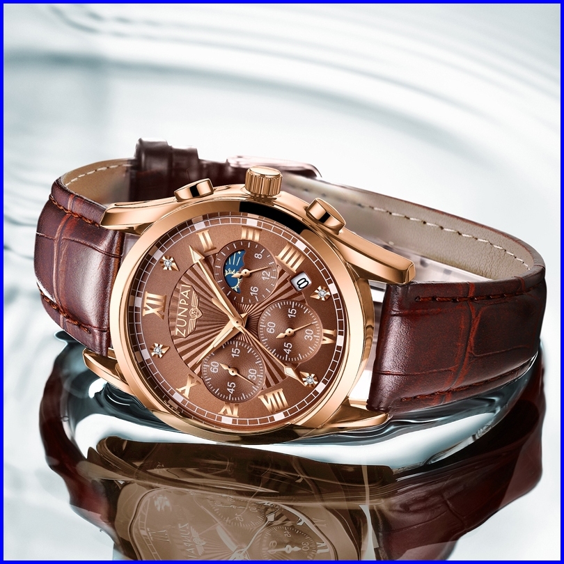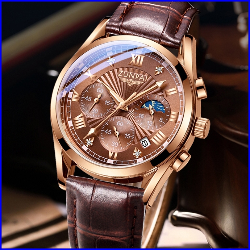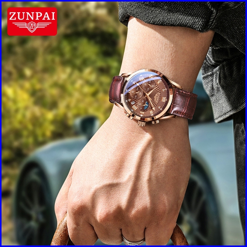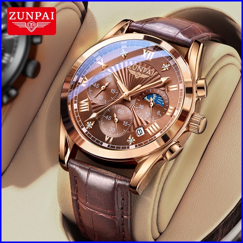 Zunpai Jam Tangan Pria Asli Tahan Air Tali Kulit Bisnis Kalender Bercahaya Coklat Mewah Kronograf Multifungsi Jam Pria S