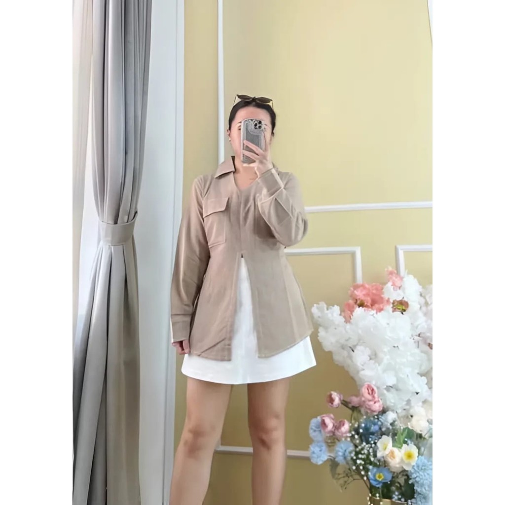 Atasan Kemeja Kantor Lengan Panjang Wanita Belah Tengah Katun Linen Polos Ootd Korean Style Casual Daily