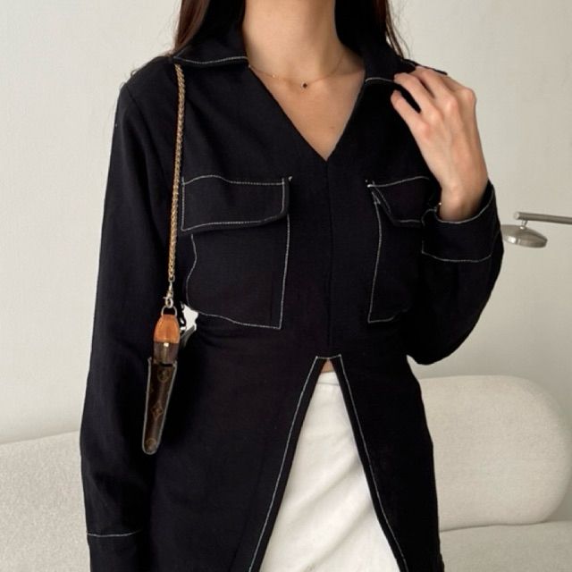 Miranda Longsleeves Pocket Slit Shirt / Atasan Kemeja Wanita Linen Dengan Tali Pinggang Blouse Lebaran Wanita Atasan