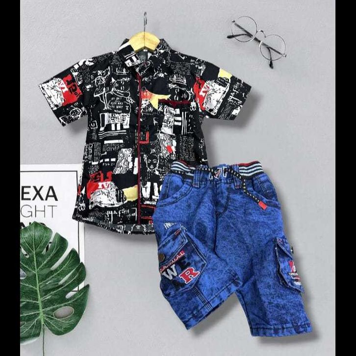 Setelan Celana Jeans Cargo Pendek Kemeja Anak Laki Laki Usia 1-12 Tahun Desain Motif Terbaru Viral