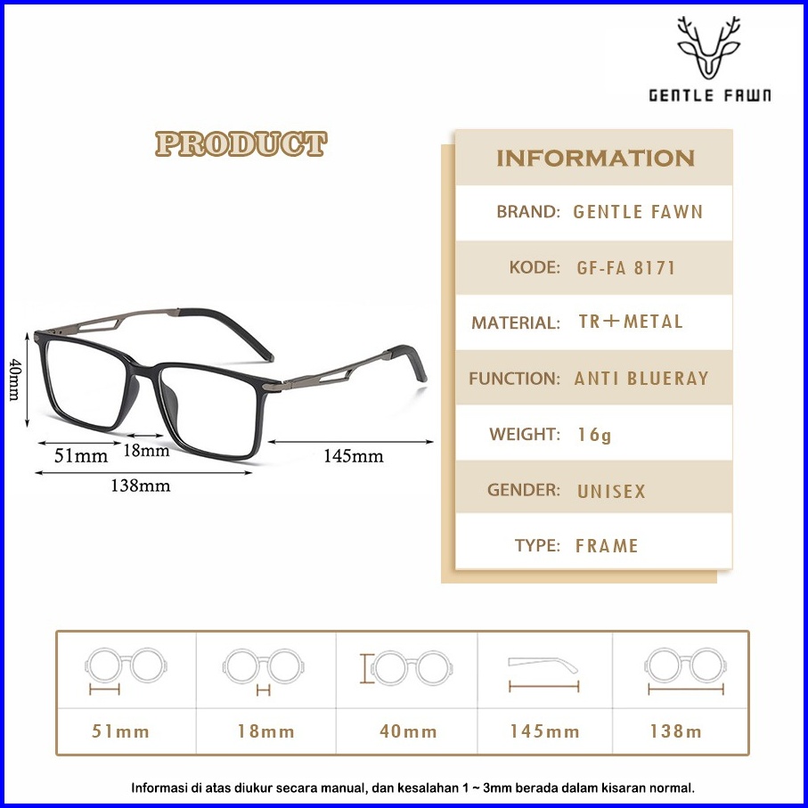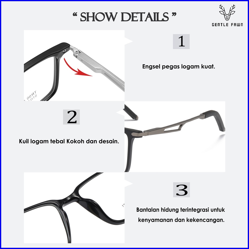Gentle Fawn Kacamata Antiradiasi Blueray Anti Uv Bisa Minus Bahan Tr90 Metal Lentur Kotak Style Fashion Pria Dan Wanita