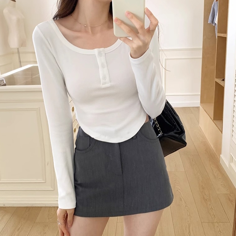Kaos Wanita Lengan Panjang Knit Blouse Wanita Premium Atasan Crop Slit Button Style Korea