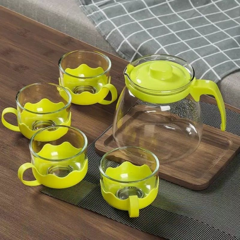 Teko Set Kaca Cangkir 4 In 1 Premium Kaca Tebal / Tea Pot Set 1 Teko 4 Cangkir Elegant