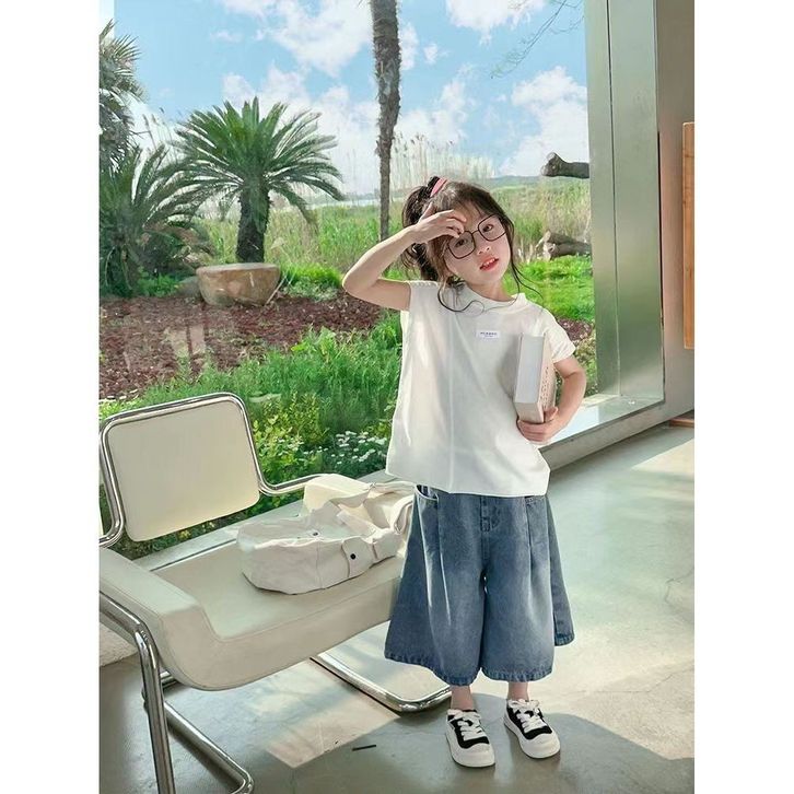Moms House Korean Style Setelan Anak Perempuan Atasan Putih Lengan Pendek+ Celana Jeans Panjang Baju Anak Perempuan