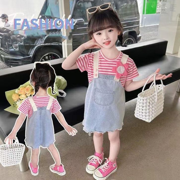 Style Terbaru Setelan Anak Perempuan T-Shirt Striped Warna Pink Bahan Katun +Dress Jeans Denim Suspender Skirt Baju Ana