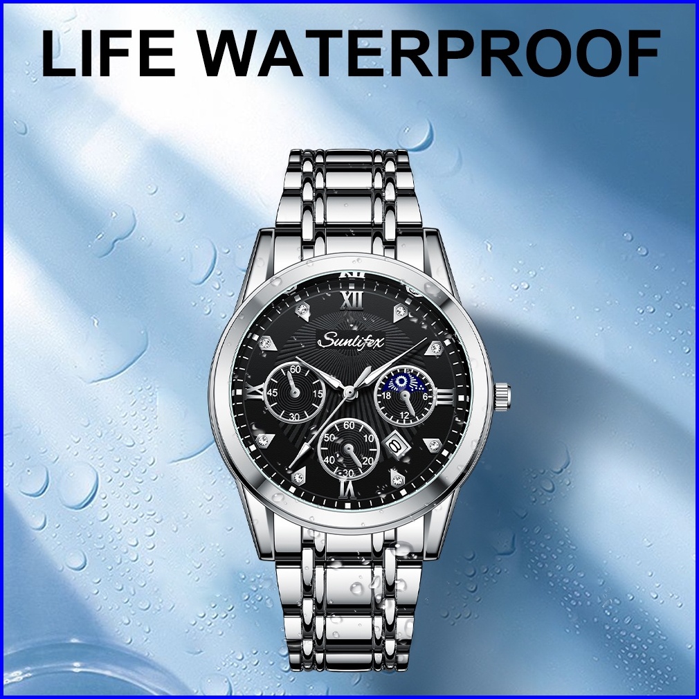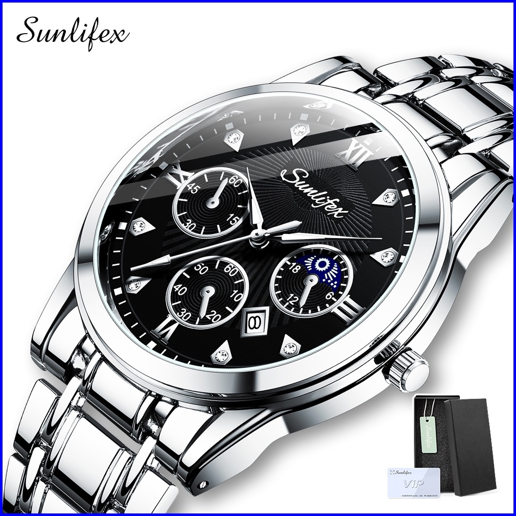 Sunlifex Jam Tangan Pria Original 9004a Kuarsa Calendar Tali Stainless Steel Mode Santai Jam Tangan Cowok