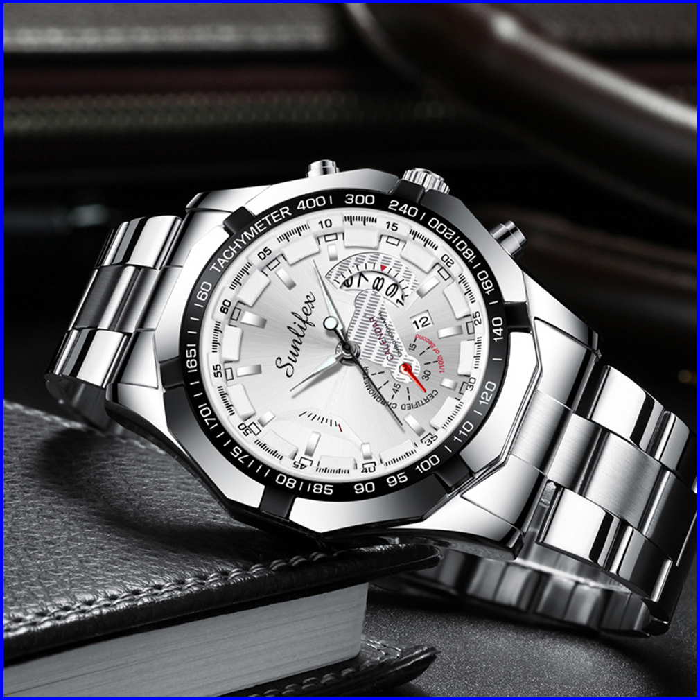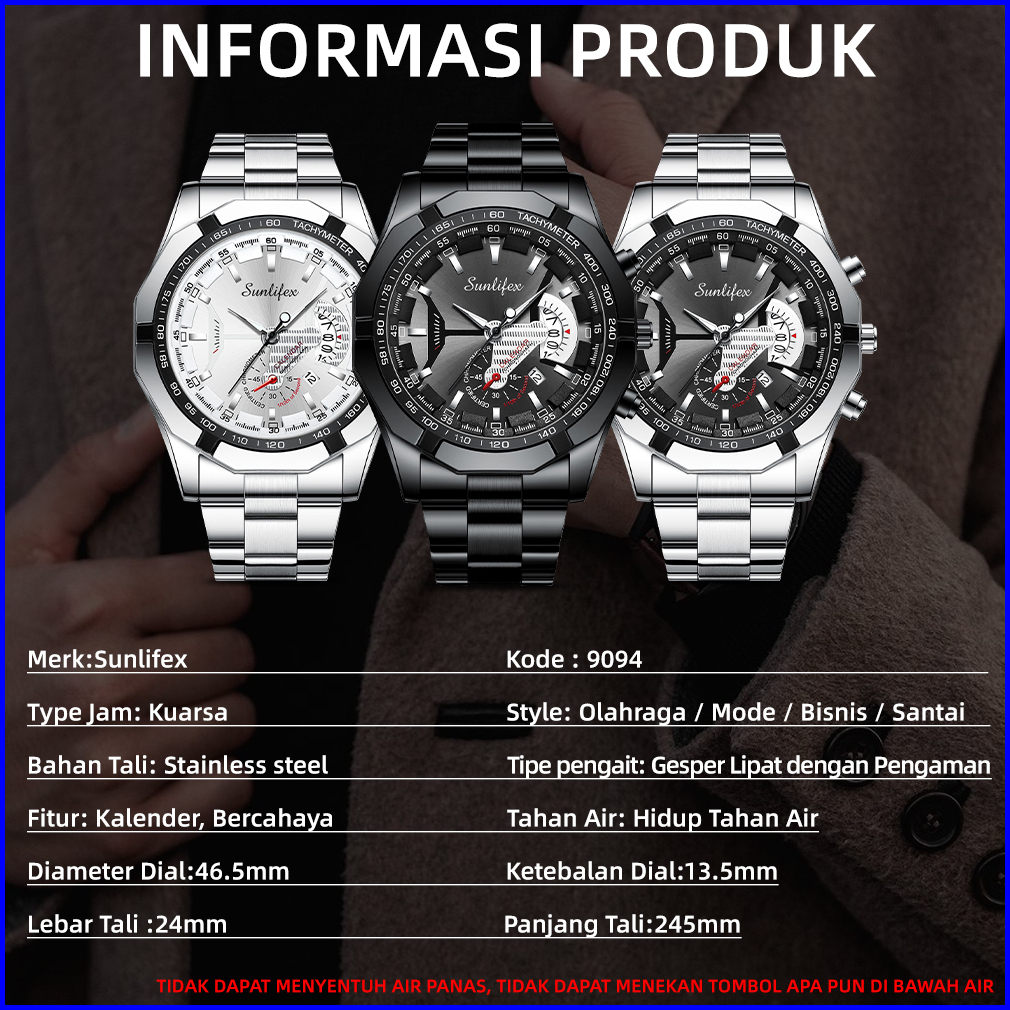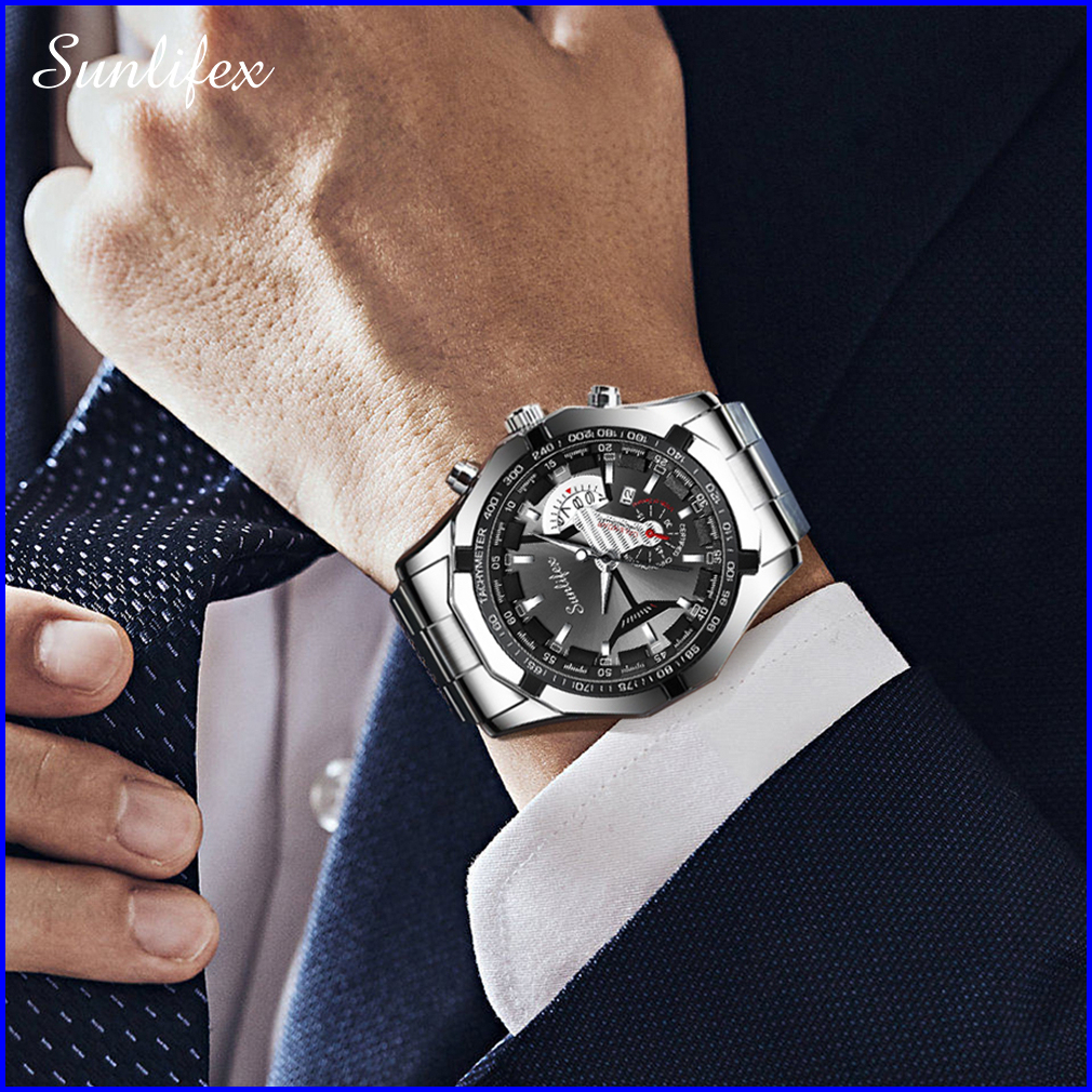 Sunlifex Jam Tangan Pria Kemewahan Mode Kuarsa Jam Anti Air Tali Stainless Steel Jam Tangan Cowok