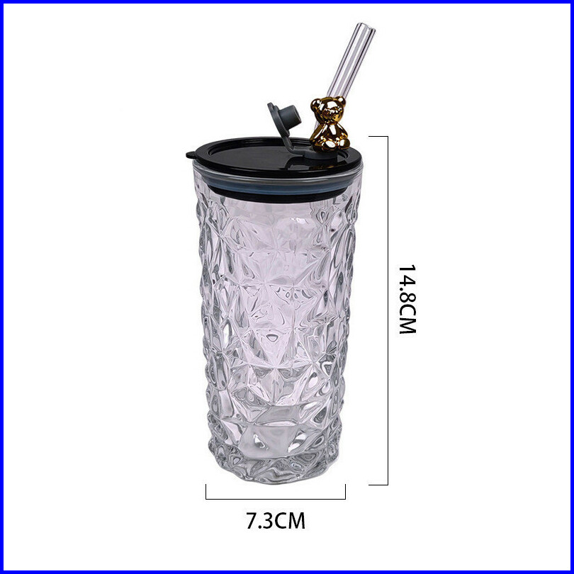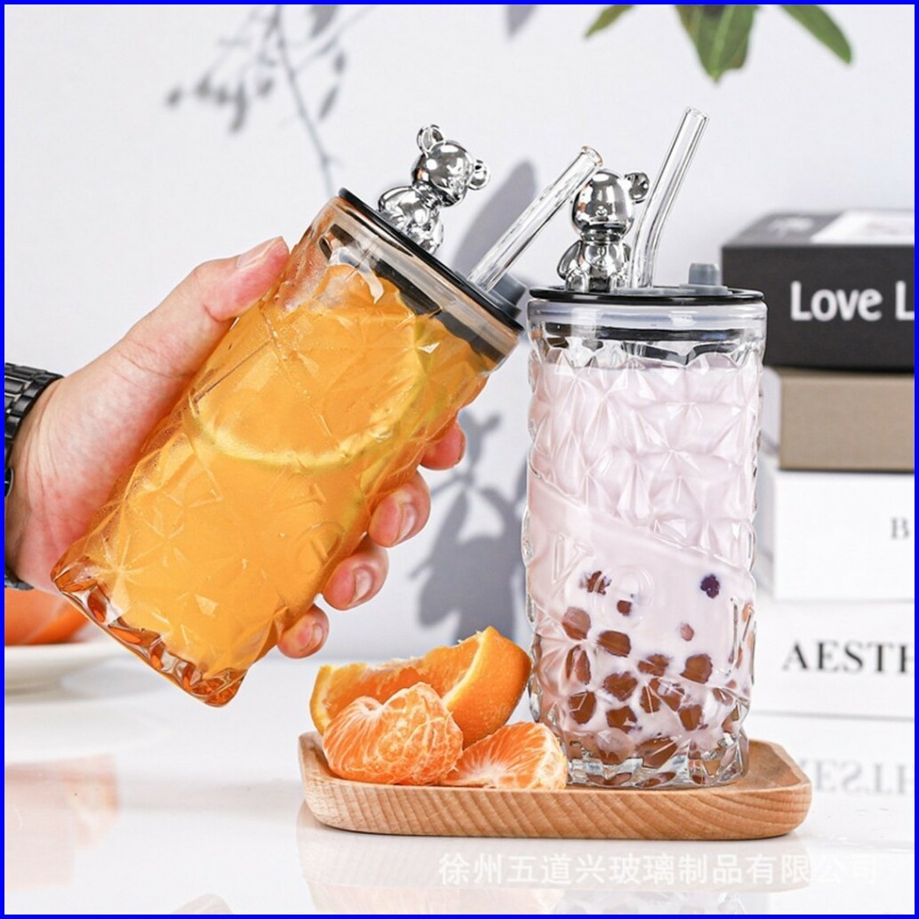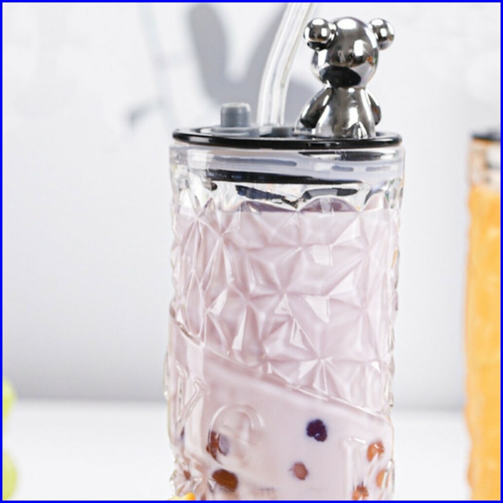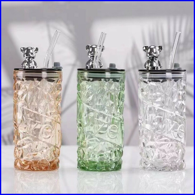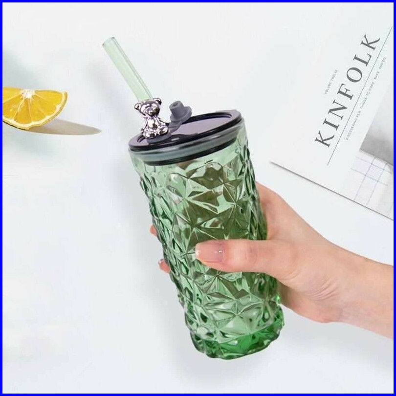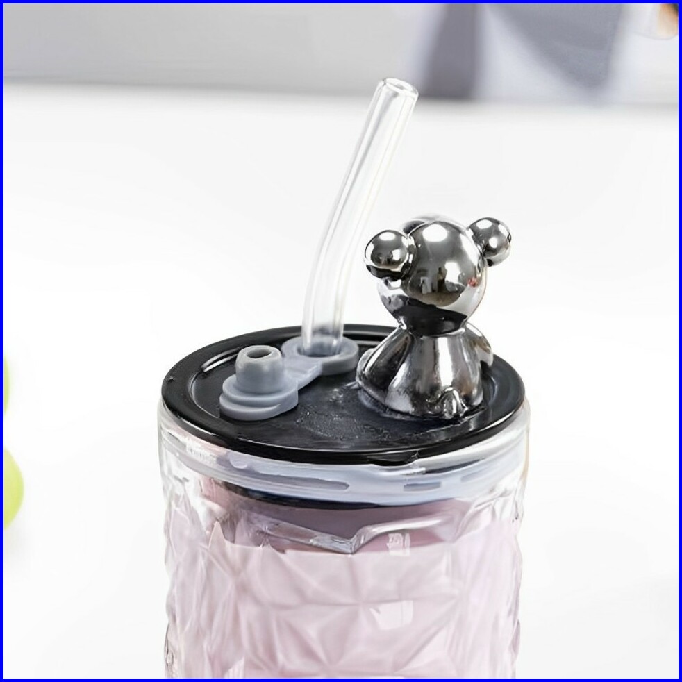 Tumblr Minum Kaca Aesthetic 350ml Botol Minum Motif Kristal Tutup Beruang Botol Minum Kaca Simple Elegan