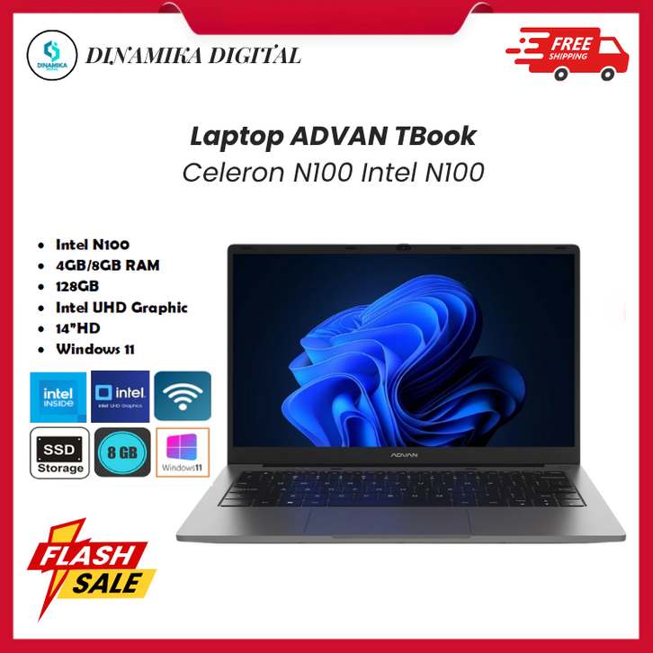 Laptop Advan Tbook Celeron N100 Intel N100 4gb/128gb (Upgradabe) 14" Hd Free Windows 11 Garansi Resmi 1 Tahun