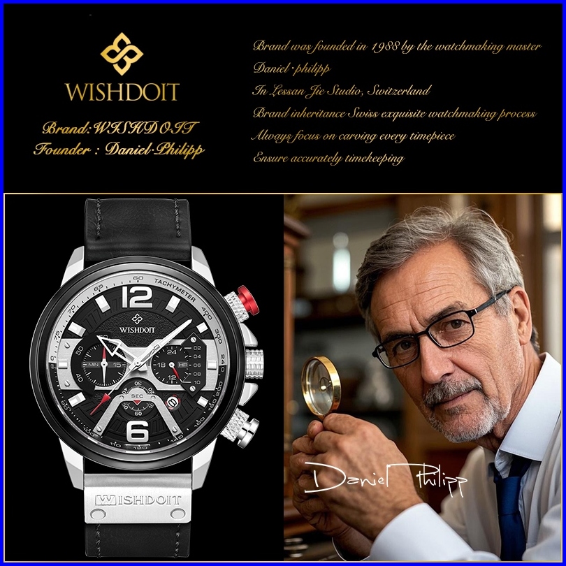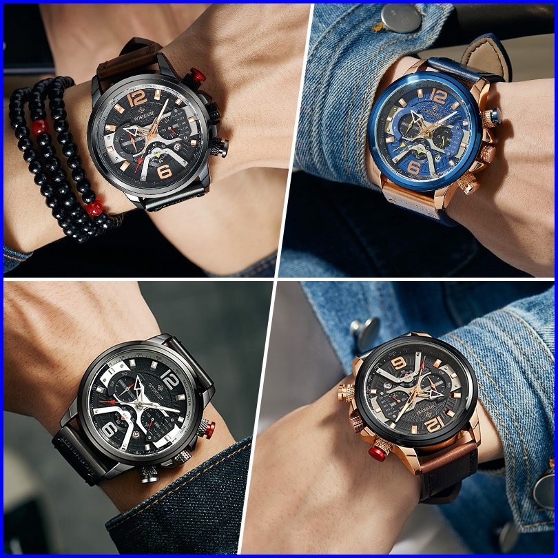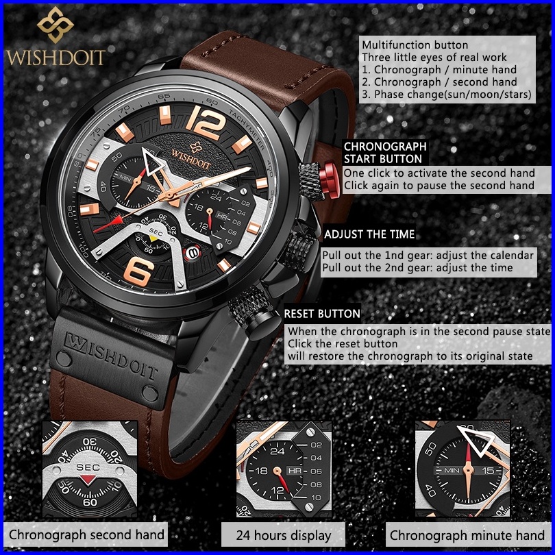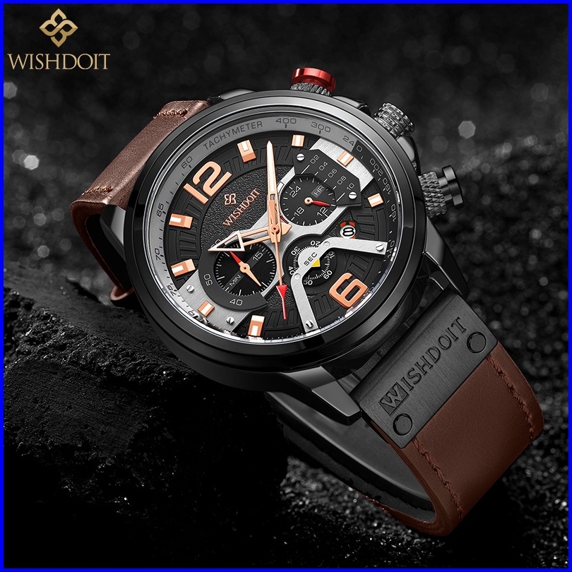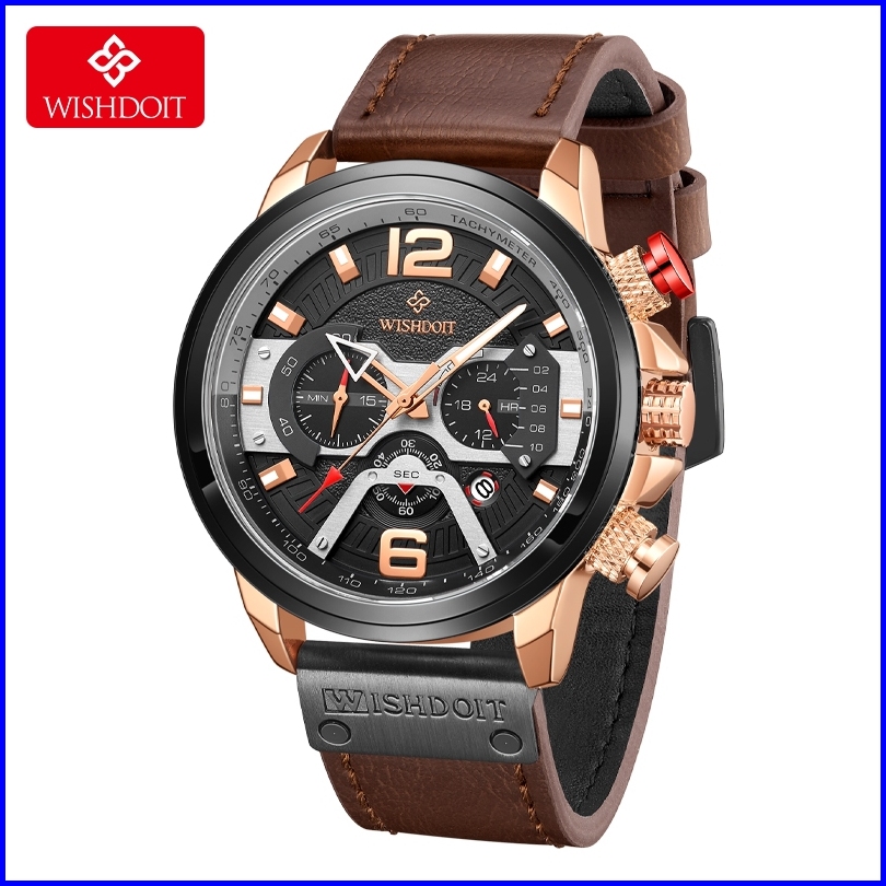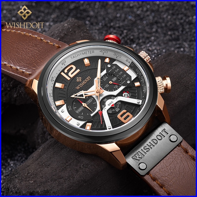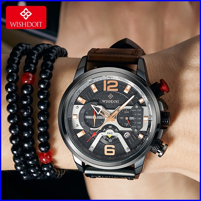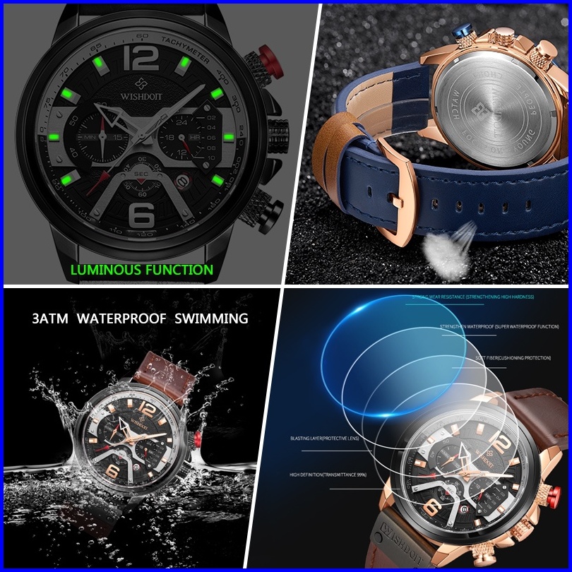 Wishdoit Jam Tangan Pria Anti Air Kulit Asli Mewahtali Kulit Baja Tahan Karat Fashion Bercahaya Multifungsi Chronograph