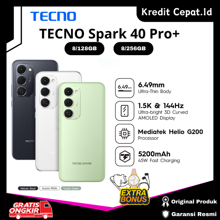 [BEST SELLER] PROMO TECNO Spark 40 Pro+ 8/256GB Mediatek Helio G200 Baterai 5200mAh+45W Garansi Resmi - Kredit Cepat.Id