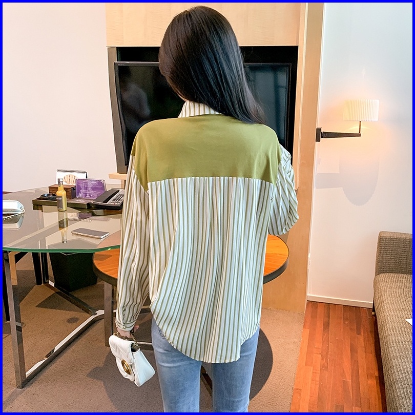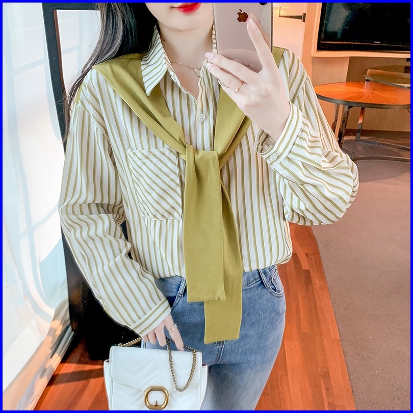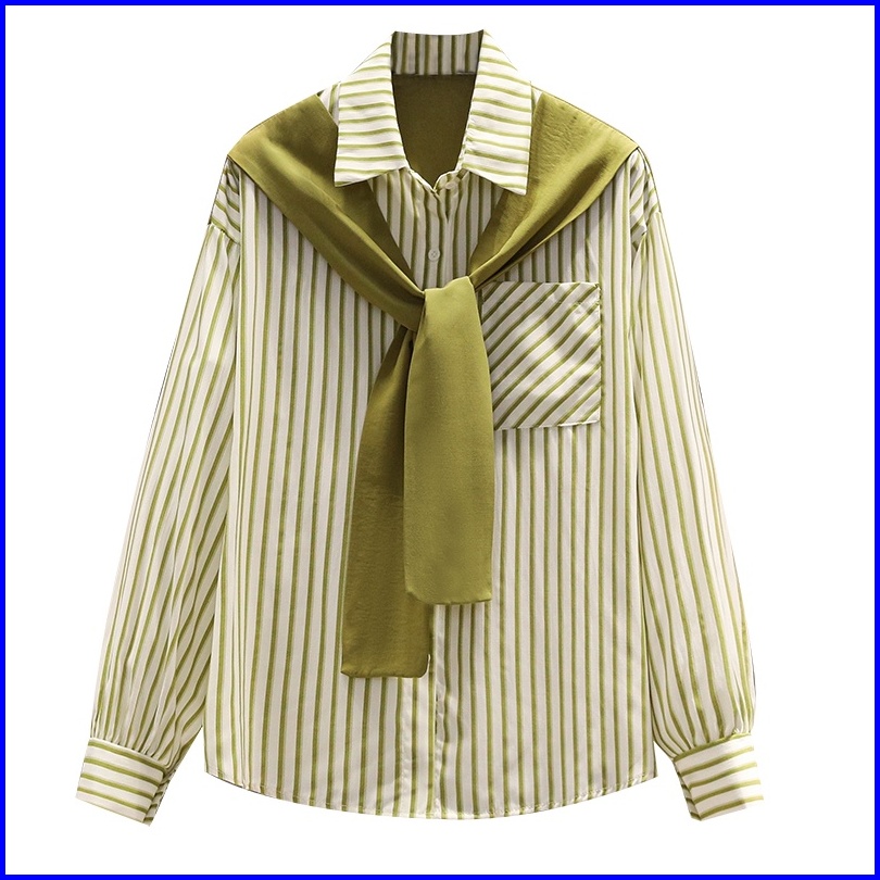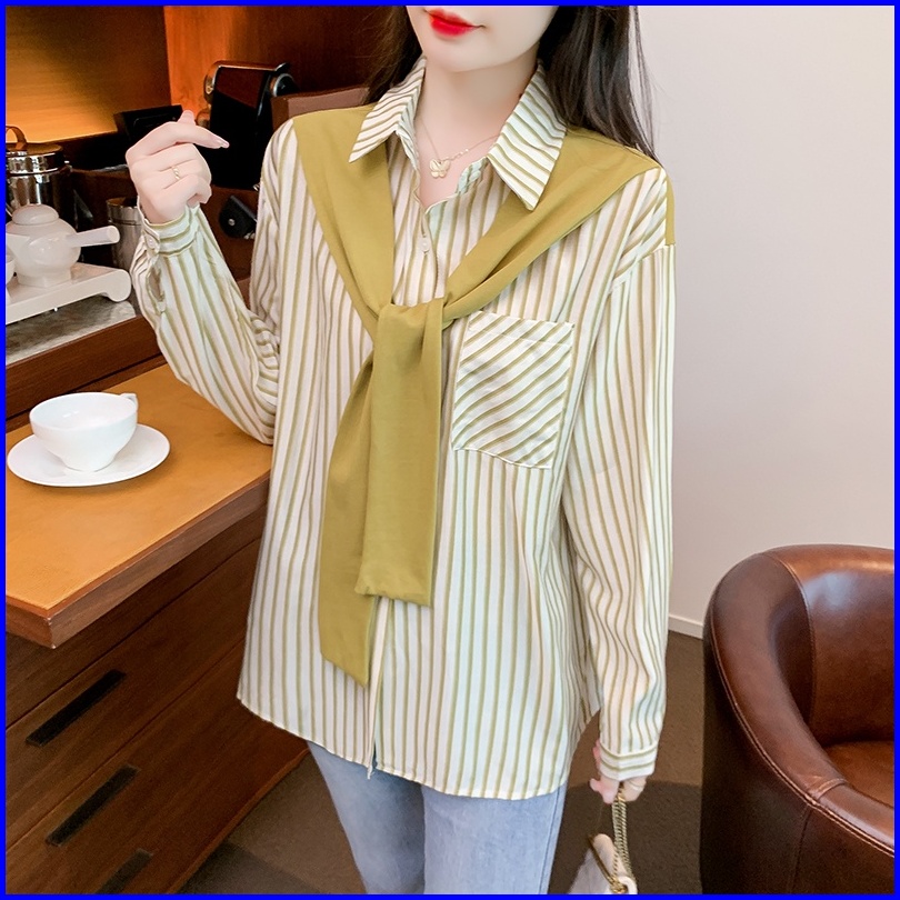New Shawl Stitching Tied Green Striped Shirt Women S Long Sleeve Loose False Two Pieces Top