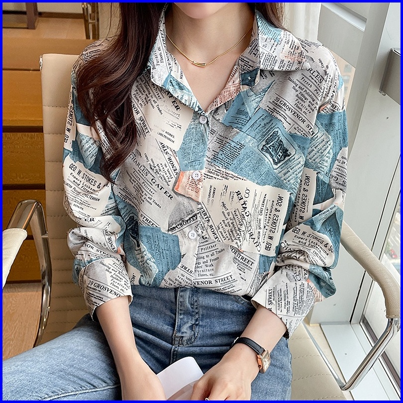 Kualitas Tinggi Cetak Koran Seni Hijau Biru Kemeja Wanita Lengan Panjang Fashion Korea Atasan Kerja Santai